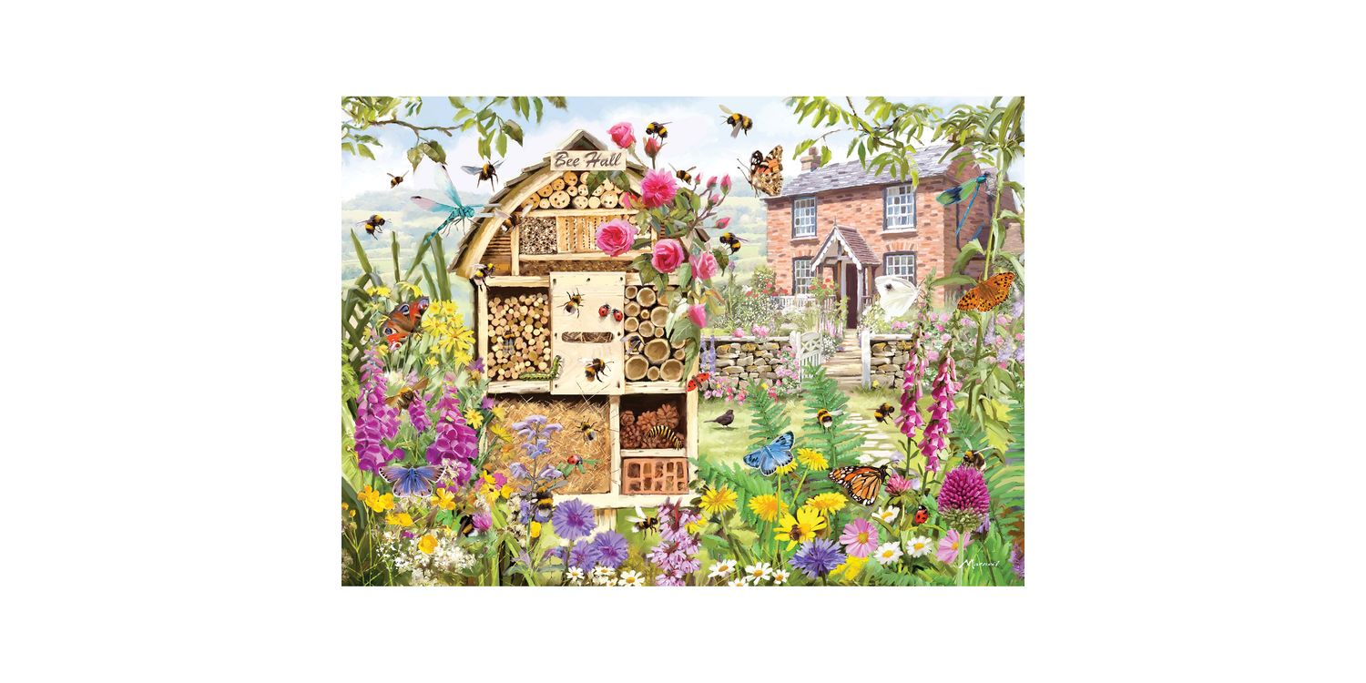 Get lost in the buzz of nature with this delightful 1000-piece puzzle. Piece together the bees as they flit around their buzzing hive hotel, collecting nectar from the vibrant flowers. Enjoy the serene view of the quaint cottage in the background, surrounded by a lush garden filled with life. Perfect for bee and puzzle enthusiasts alike, this puzzle was painted by the talented Richard Macneil and will keep you buzzing for hours!