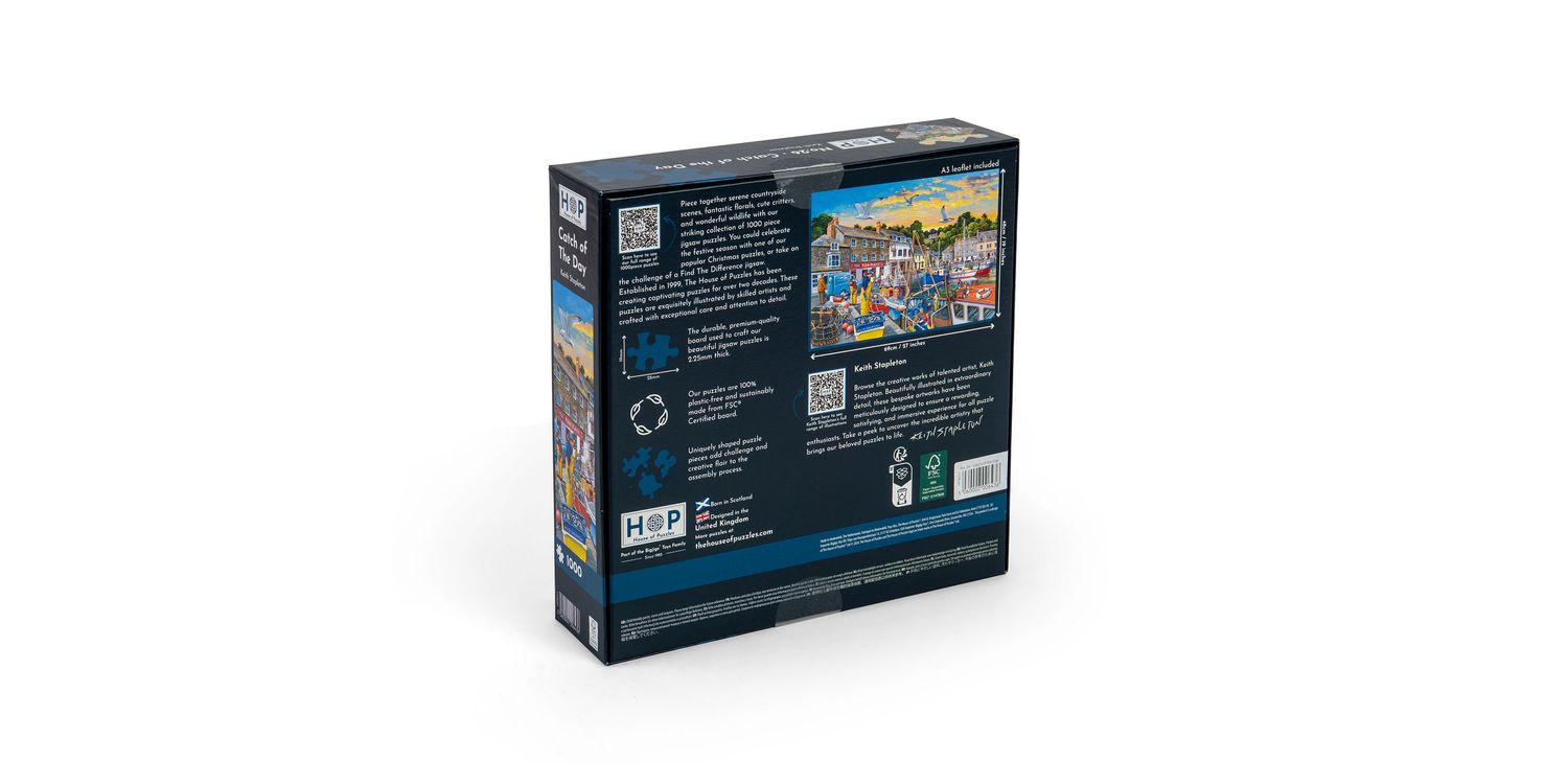 Get ready to start your next House of Puzzles project! Illustrated by extraordinary artist Keith Stapleton, the No. 26 - Catch of the Day 1000 piece jigsaw features a beautifully detailed scene to captivate both beginner and seasoned puzzle fanatics! All of our 1000 piece jigsaw puzzles are sustainably made from premium quality FSC® Certified board, promising a satisfying and seamless assembly experience.