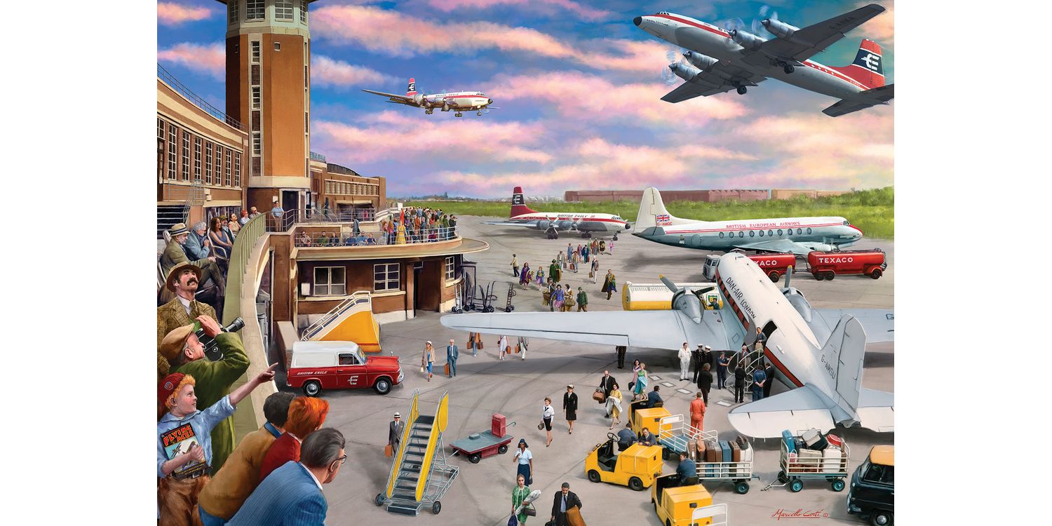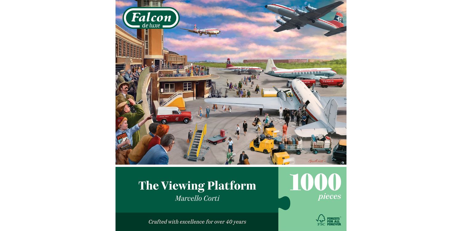 Falcon de luxe Falcon - The Viewing Platform 1000 pieces This vibrant image takes us on a delightful trip back in time to a bustling airport, when air travel was a glamorous event and everyone wanted a glimpse of the action.