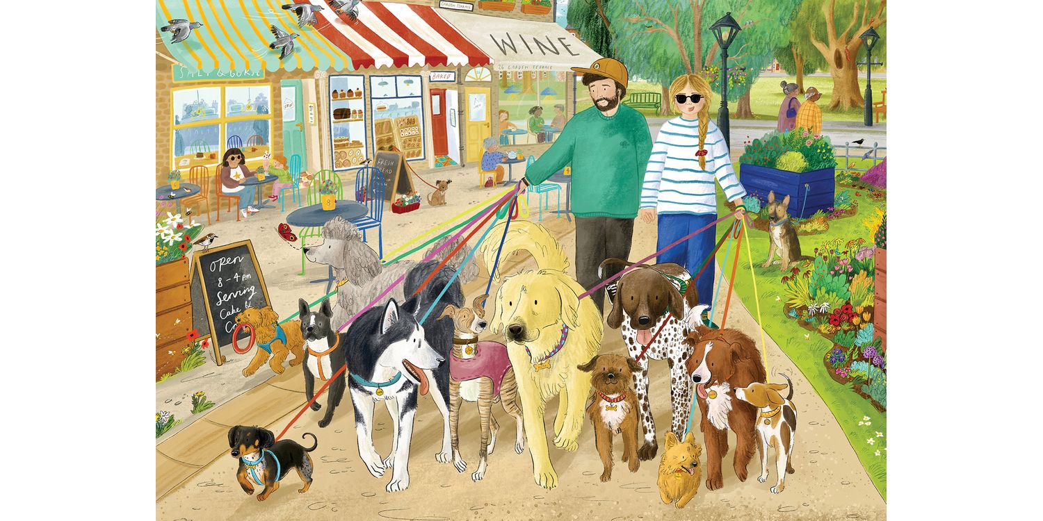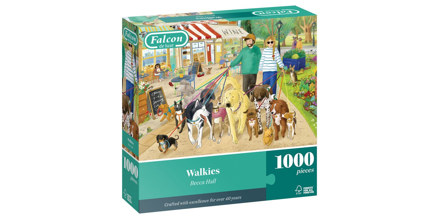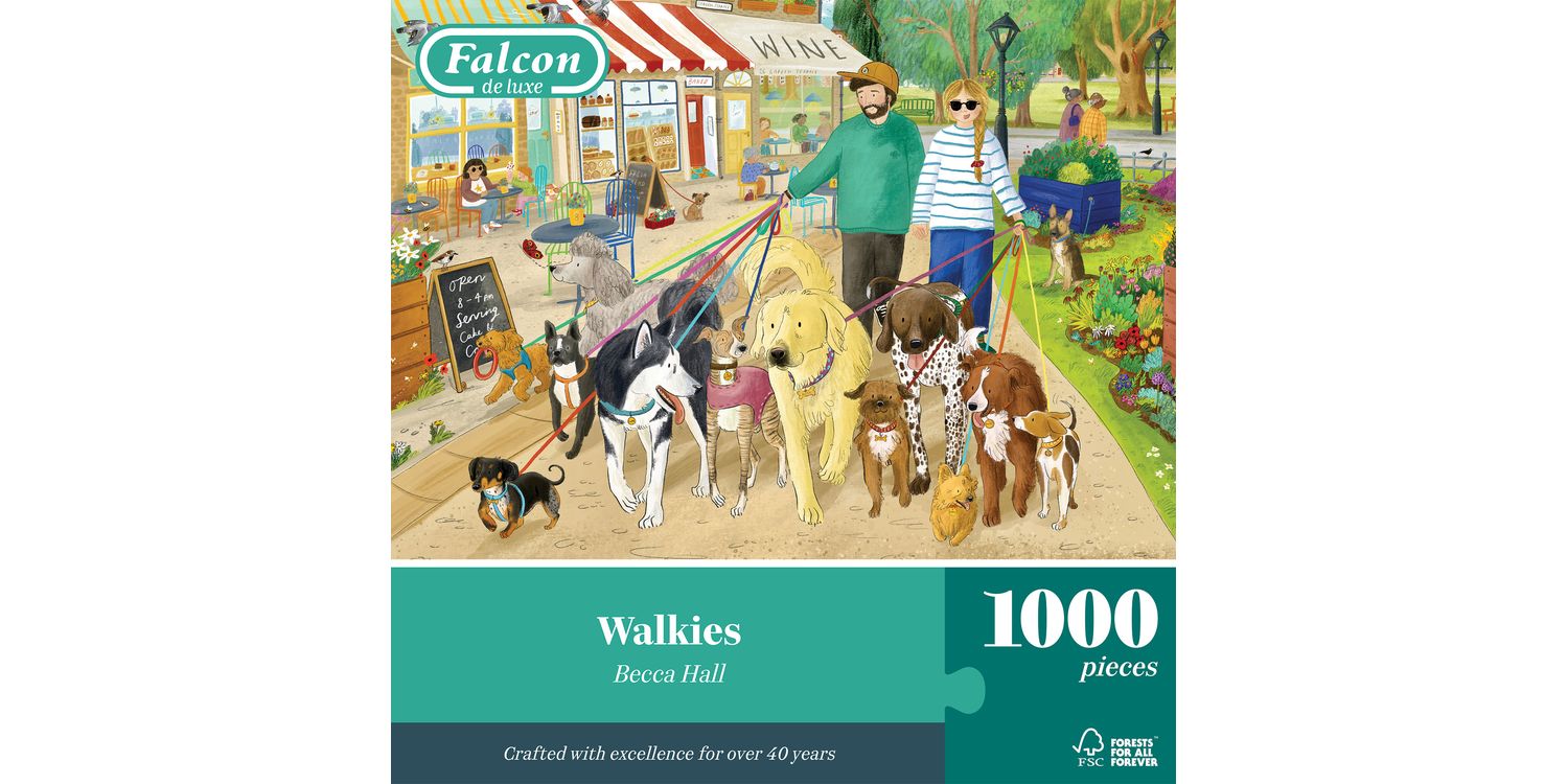 Falcon de luxe Falcon - Walkies 1000 pieces. This lively scene captures two happy dog walkers with their hands, and leashes full! From the majestic husky to the tiny, scrappy terrier, these pups are ready for adventure. You can almost hear the panting, barking and wagging tails as they trot along the street! Illustrated exclusively for Falcon by Becca Hall. Falcon jigsaw puzzles are designed and crafted with a passion for excellence, celebrating our unique brand heritage and spirit of innovation. Produced using a high - quality recycled board with distinctive blue backing and special precision cutting techniques, we ensure every jigsaw piece maintains its original shape for puzzling fun that lasts. At Falcon, we combine beautifully finished, high - quality images with colourful themes that offer something to suit every puzzler.