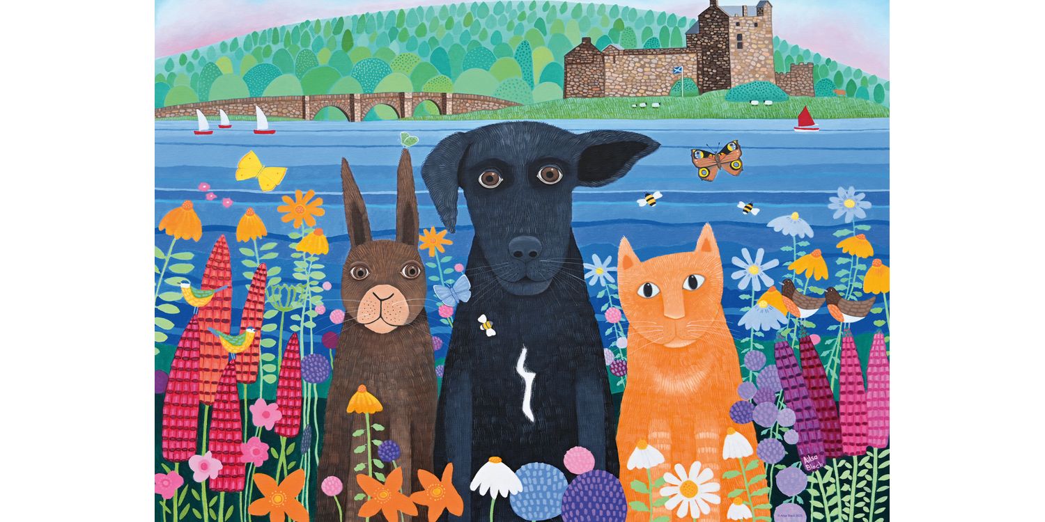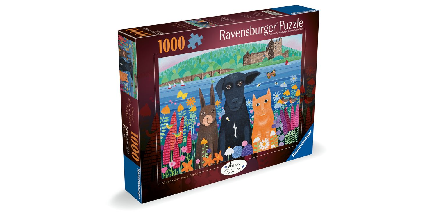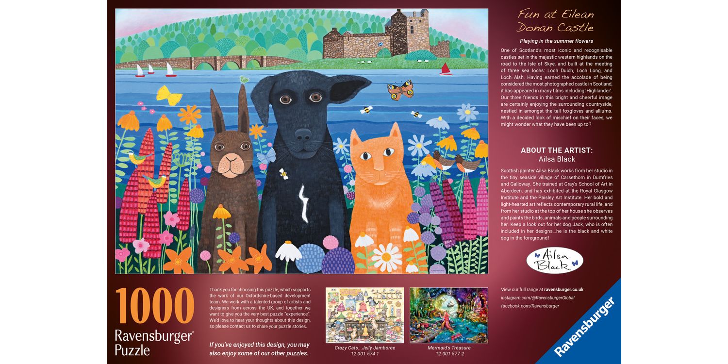 Piece together a charming scene set against the breathtaking backdrop of Eilean Donan Castle, one of Scotland’s most iconic landmarks. In this delightful 1000-piece jigsaw, created by artist, Alisa Black, three adorable friends—a playful black dog, a curious ginger cat, and a sweet rabbit—sit among wildflowers, gazing warmly towards you. With rich colours, intricate details, and a heartwarming composition, this puzzle offers hours of relaxing enjoyment. Perfect for animal lovers, puzzle enthusiasts, and anyone who cherishes the beauty of Scotland’s landscapes. Enjoy a peaceful puzzling experience as you bring this enchanting scene to life! Our 1000 piece jigsaws are crafted with premium quality materials and measure 70 x 50cm when complete. Great for Adults and ideal puzzles for Children 12 years old and up. Fully complies with all necessary UK and EU testing standards.
