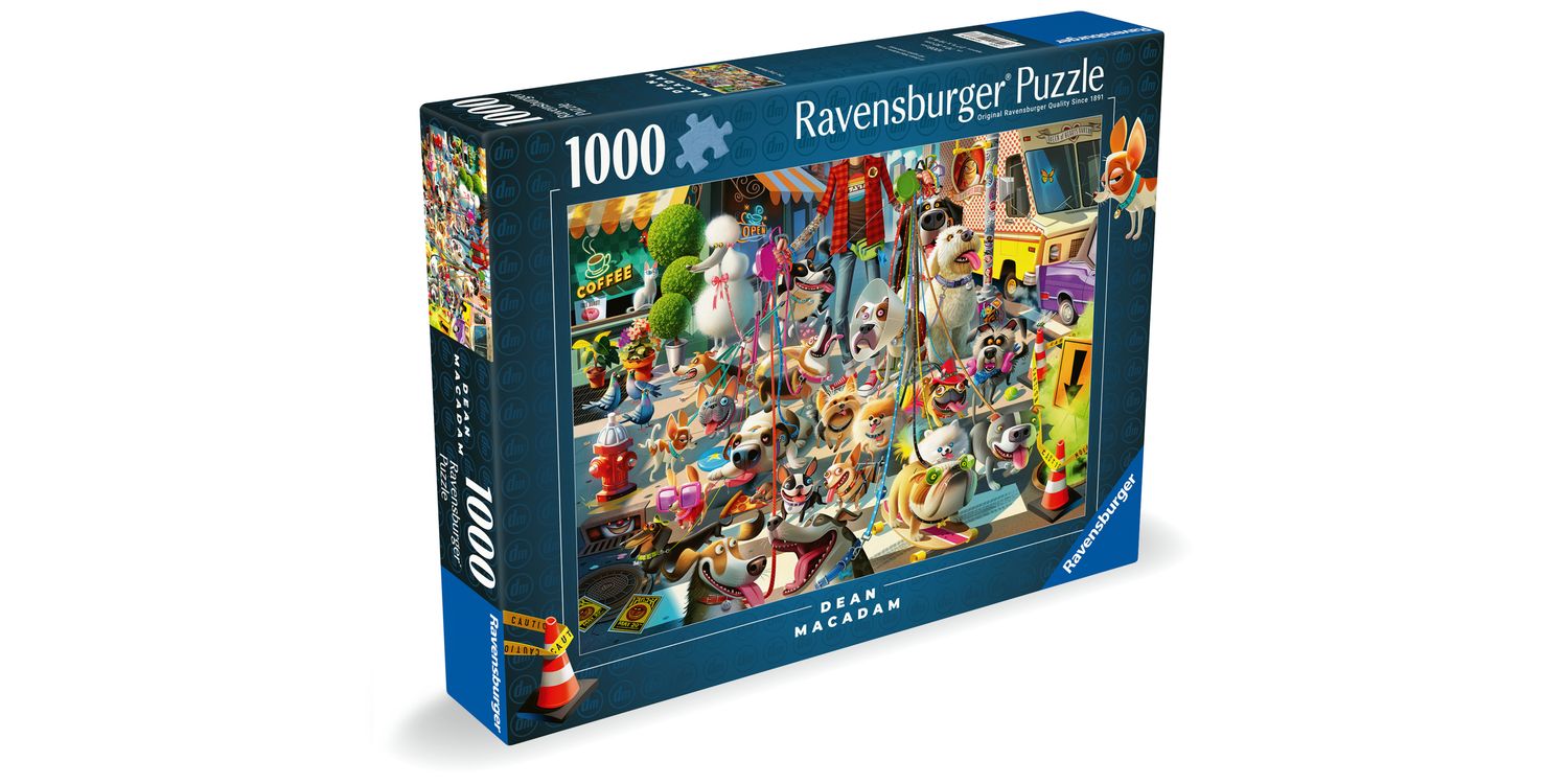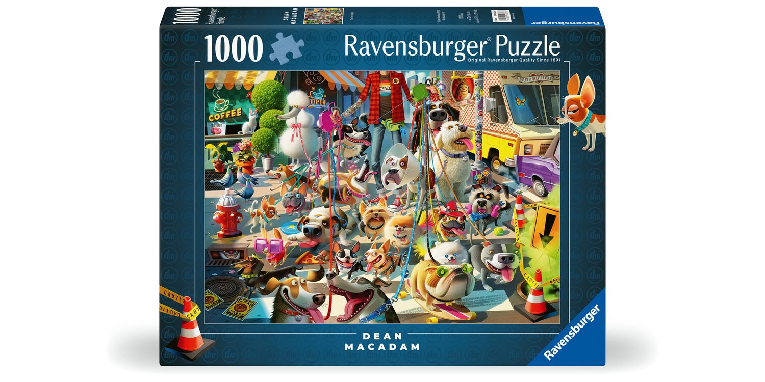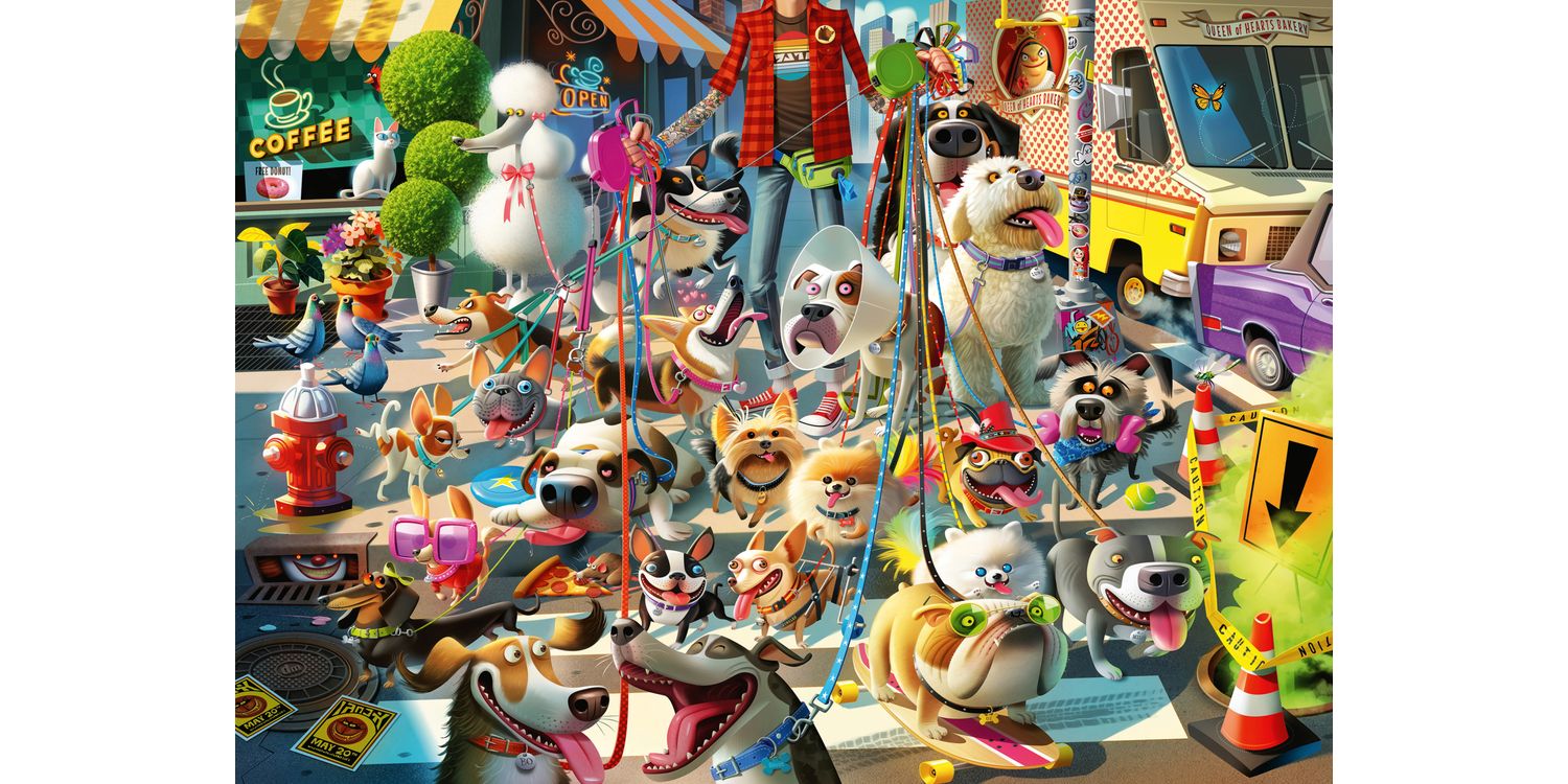 Doggone it, that’s one ambitious dude, with 23 woofers to walk! That hoard of hounds includes a mix of mutts and breeds from a tiny Yorkshire Terrier to a huge Saint Bernard. Fifi the Poodle is not pleased to be hitting the mean streets of the city, and poor Duke is mortified to be seen in public wearing a cone of shame! “The Dog Walker” includes all the quirky fun you’ve come to enjoy in Dean MacAdam’s puzzles — he’s even added some Ravensburger Easter eggs for added entertainment — enjoy!
