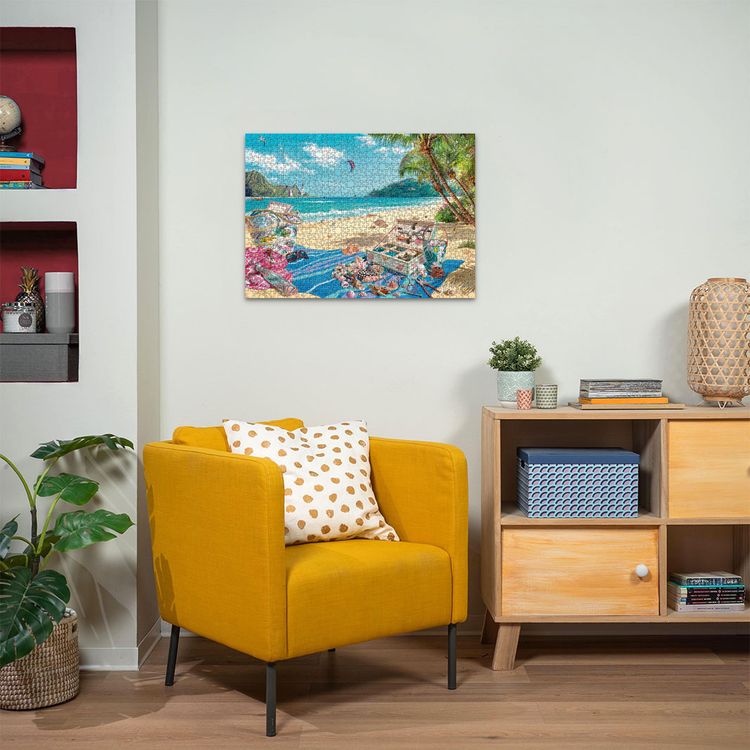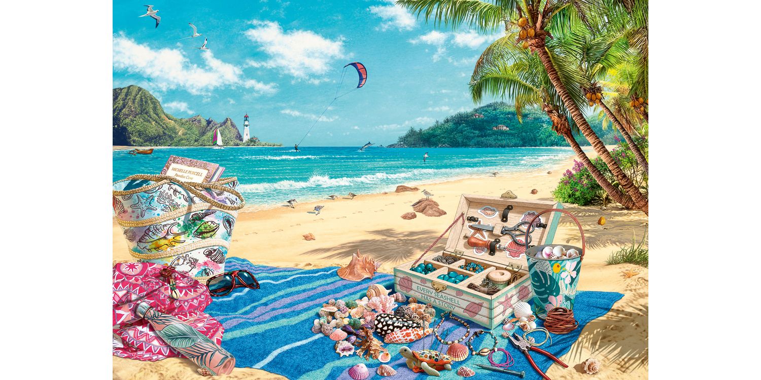 Imagine collecting shells and transforming them into beautiful jewellery, charms, tassels and objet d'art.  Our shell collector has found some stunning shells on this idyllic beach and has their tools at the ready to create some charming and unique pieces.  This beach looks like paradise, and is the perfect place to find inspiration.  And when you need to relax your eyes and have a rest you can just gaze out to sea or wander along the beach again ... you never know what treasures you may find! Our 1000 piece jigsaws are crafted with premium quality materials and measure 70 x 50cm when complete. Great for Adults and ideal puzzles for Children 12 years old and up. Fully complies with all necessary UK and EU testing standards.