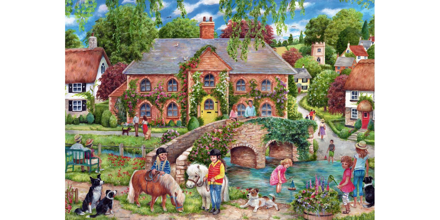 Step into the serene and picturesque charm of rural living with this delightful 1000-piece puzzle, "Village Life." This captivating puzzle captures a tranquil village scene brimming with life and activity. Amidst the rolling green hills, you’ll find cozy cottages with thatched roofs, a quaint stone bridge arching over a gentle river, and friendly villagers going about their day. A young girl is sailing her toy boat on the river. The village buzzes with a warm sense of community as people walk along the paths, engage in cheerful conversation, and enjoy the simple pleasures of village life. Our 1000 piece jigsaws are crafted with premium quality materials and measure 70 x 50cm when complete. Great for Adults and ideal puzzles for Children 12 years old and up. Fully complies with all necessary UK and EU testing standards.