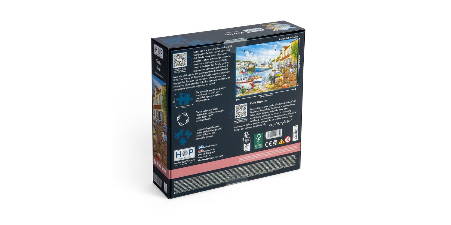 Go large with this Big 500 piece jigsaw puzzle! Illustrated by talented artist Keith Stapleton, our Ship Inn jigsaw features extra-large puzzle pieces which are easier to handle and slot into place. The Big 500 range is a perfect family activity, as the chunky jigsaw pieces enable all ages to join in and work together. All of our Big 500 piece puzzles are sustainably made from premium quality FSC® Certified board, promising a satisfying and seamless assembly experience.