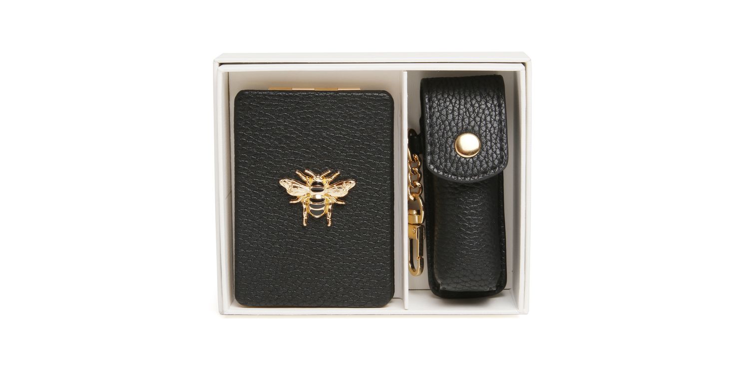 This set includes our popular vegan leather-covered Oblong mirror compact, a cornerstone of our design collection, known for its elegant appeal and practicality for both gifting and personal use. It also introduces our brand-new lipstick holder, a cute way to secure your favourite lipstick. It comes complete with a clip for attaching to one of our bags or even a keyring, keeping your essentials close at hand. Each set arrives in a pristine white gift box, expertly wrapped and ready for any occasion, making gifting effortless.
