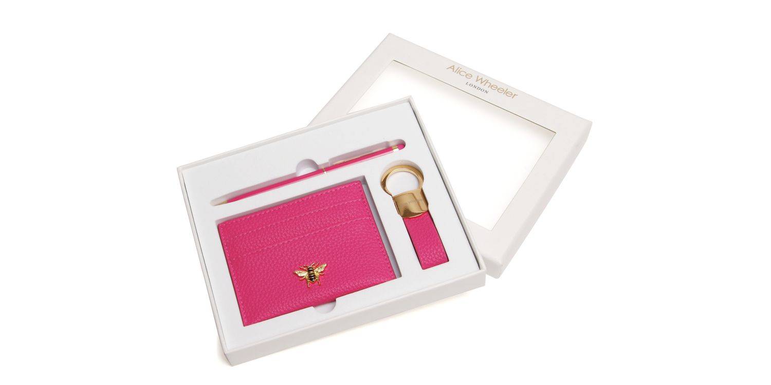 Alice Wheeler London Luxury 3-Piece Gift Set: Bow Card Holder, Loop Keyring & Pen Introducing the ultimate gift for someone special — the Alice Wheeler London 3-Piece Gift Set, featuring a beautifully coordinated trio of everyday essentials: the elegant Bow Card Holder, the all-new Loop Keyring, and the stylish Alice Wheeler Pen. Thoughtfully presented in a sleek gift box and available in five stunning colours, it's the perfect way to treat a loved one — or yourself.