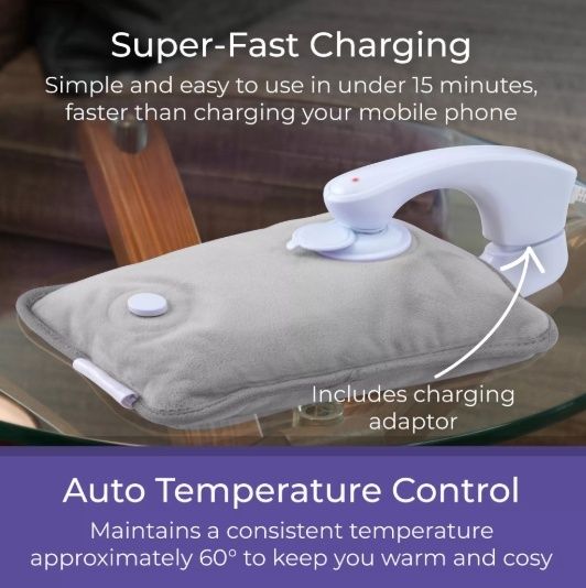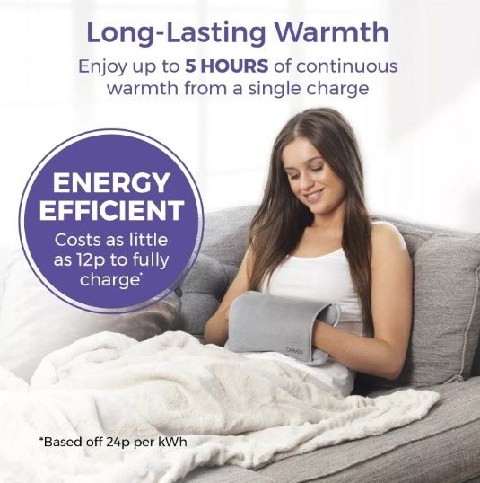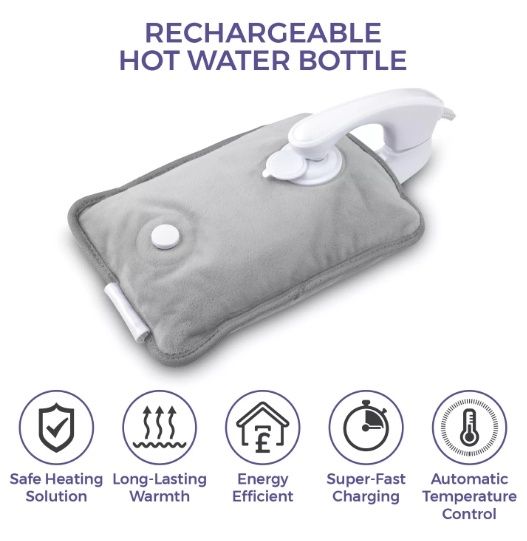 Make bedtime even cosier with this Rechargeable Hot Water Bottle from Carmen. Safe and simple to use, it comes pre-filled with water and permanently-sealed so you never have to refill with boiling hot water or worry about leaking. Charging faster than a phone in under 15 minutes, it’s almost instantly ready for overnight use and keeps the water warm while unplugged for up to 5 hours. It only costs as little as 12p* to fully charge the Hot Water Bottle, keeping yourself warm and cozy, while you snuggle up on the sofa and save on expensive energy bills. The heat also has fantastic health benefits – not only keeping you warm in winter – it also helps soothe cramps, aches and pains, as well as improve blood circulation for longer-lasting comfort. Automatic temperature control provides the optimal amount of heat up to 70-75°C, while overheat protection ensures safe use. Designed using soft, comfy material and with a built-in pouch to keep your hands warm, this electric hot water bottle is made for a warmer, more comfortable night’s sleep. *(Based off 24p per kWh)