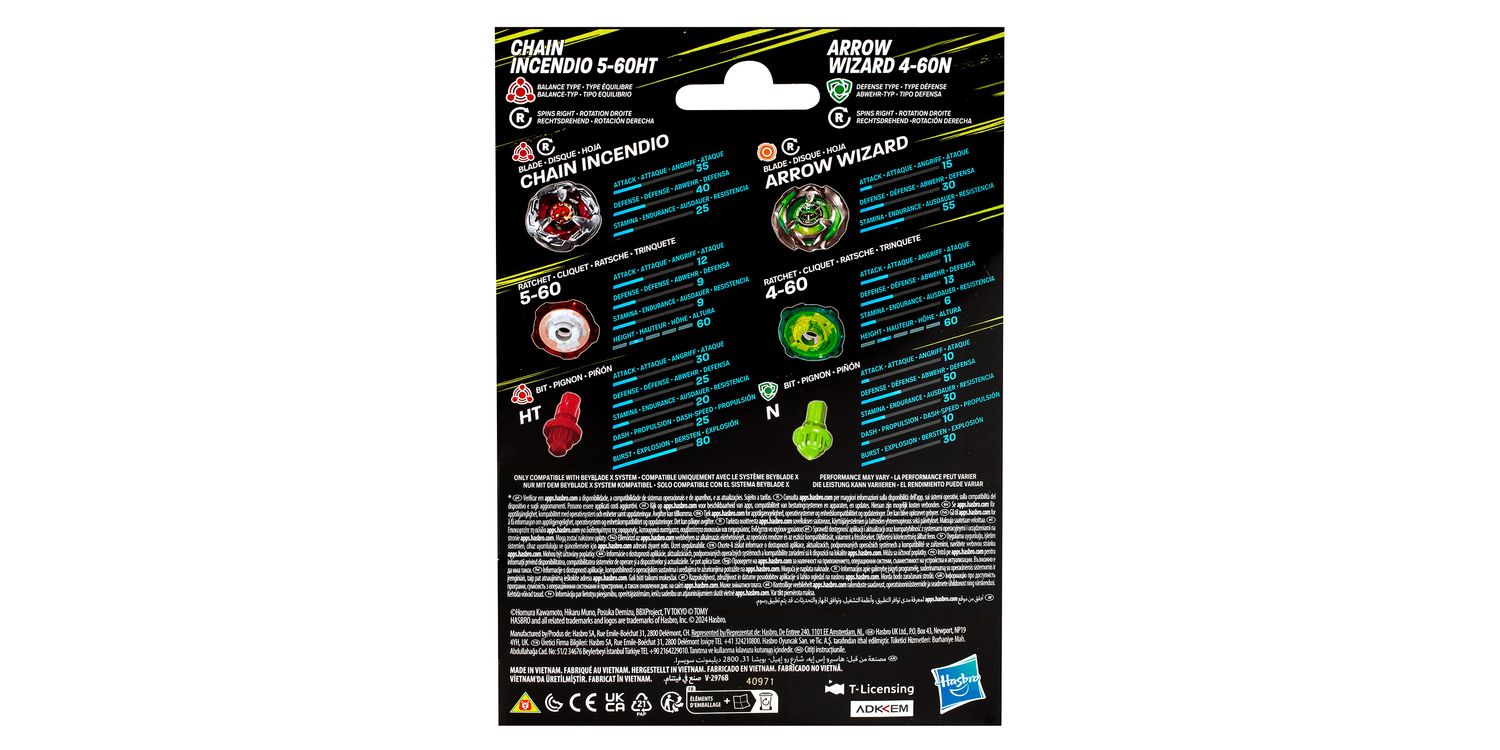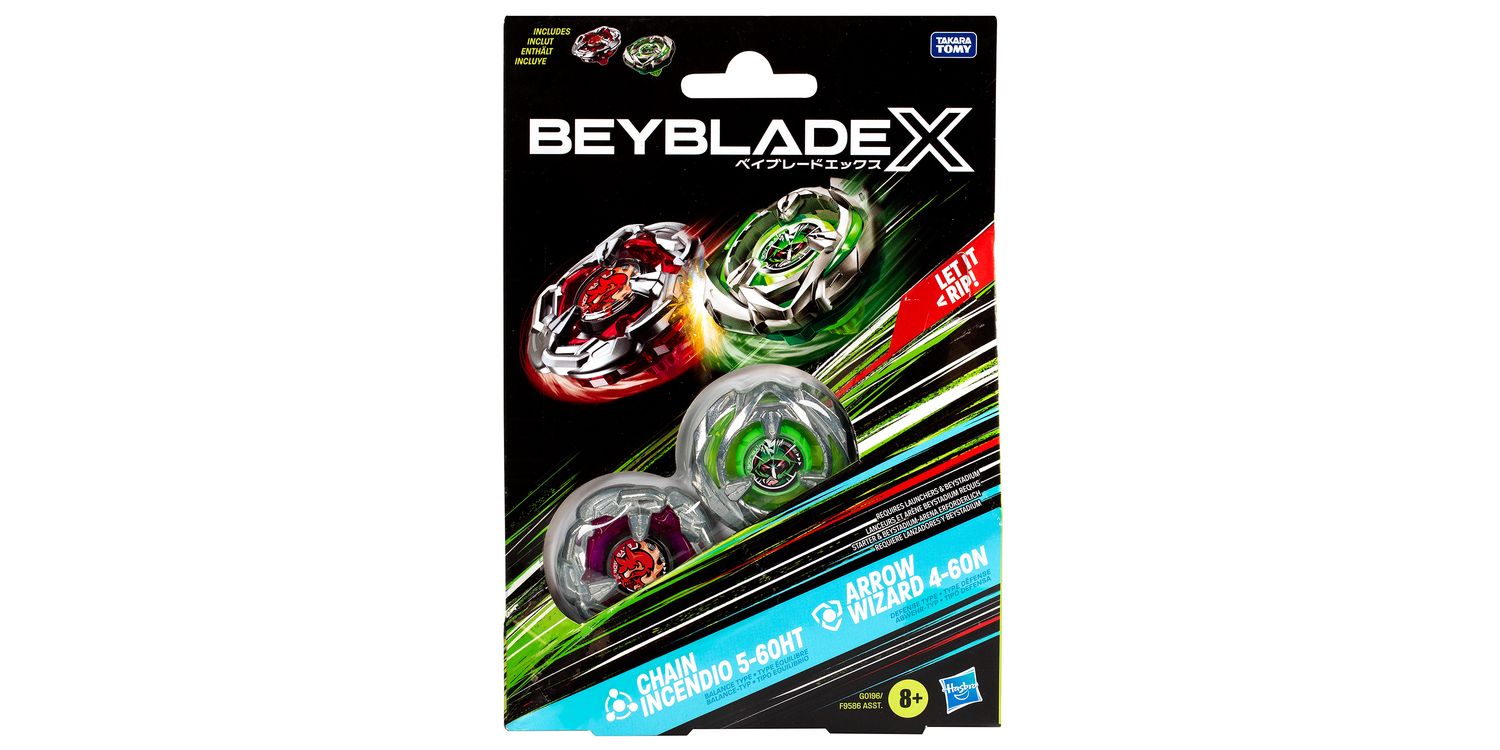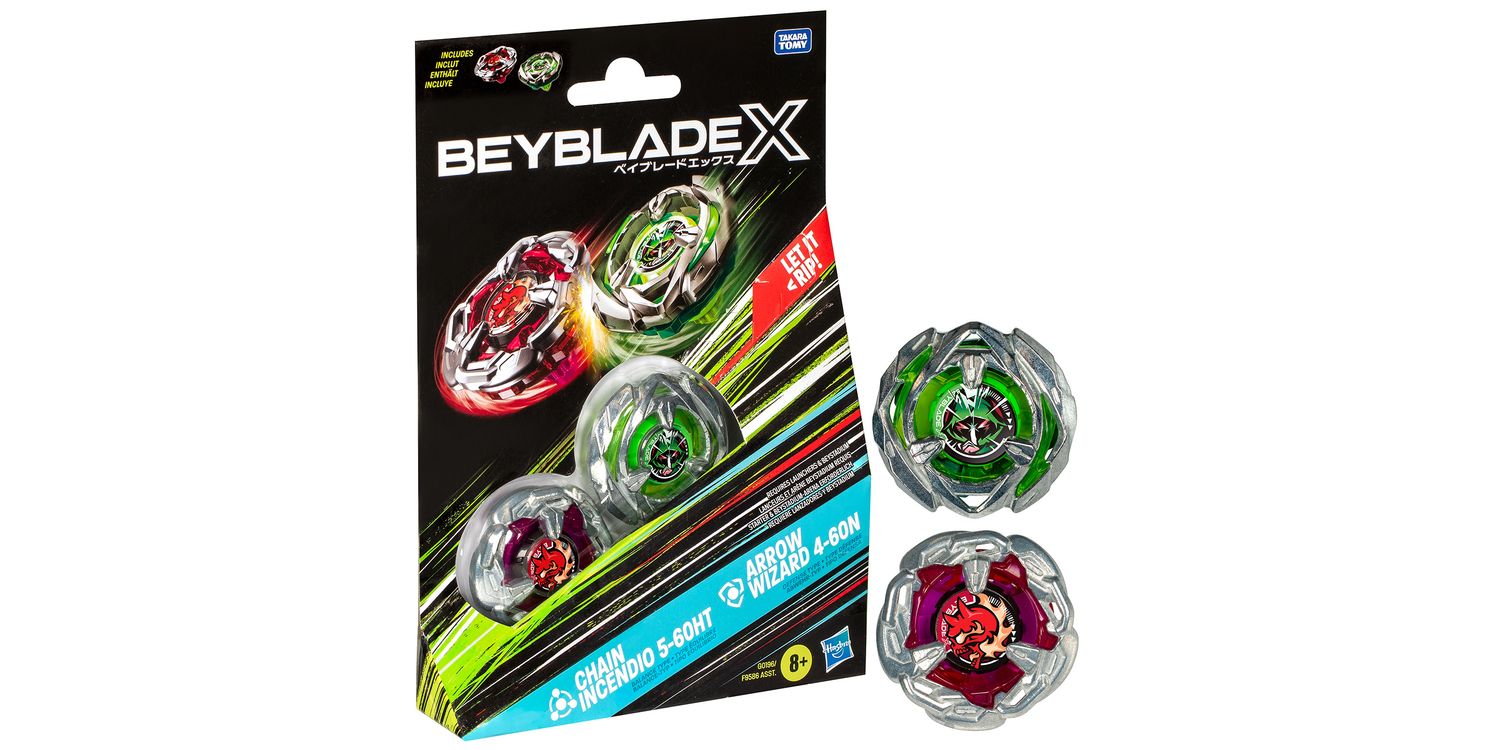 Experience the thrill of the next generation of Beyblade stadiums, launchers and tops: Beyblade X with the Beyblade X Chain Incendio 5-60HT and Arrow Wizard 4-60N Dual Pack Set which includes 2 right-spinning tops (Beystadium and launchers required, sold separately). Launch right into battle or reconfigure the interchangeable blade, ratchet, and bit of this Dual Pack with those of other Beyblade X tops (sold separately) to create your own unsurpassable Bey. Beyblade X features the X-Celerator Gear System innovation to level-up your game. When the gear of a Beyblade X top engages the rail of the Beystadium arena, it can superaccelerate into an Xtreme Dash rocketing it around the stadium for crushing collisions and epic bursts. Bladers launch their tops into fierce clashes against their opponent’s scoring points with each confrontation – first to score 4 points wins. Hasbro Beyblade toys with authentic Takara Tomy die-cast metal tops make great kids gifts for boys and girls ages 8 and up.
