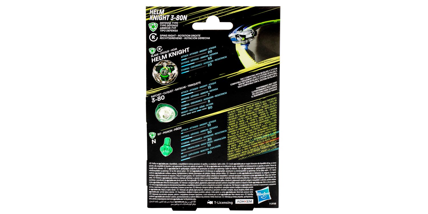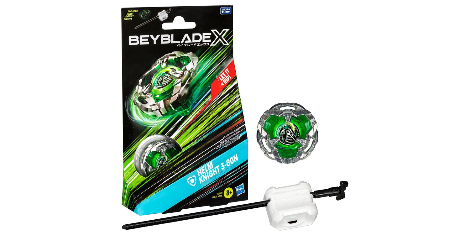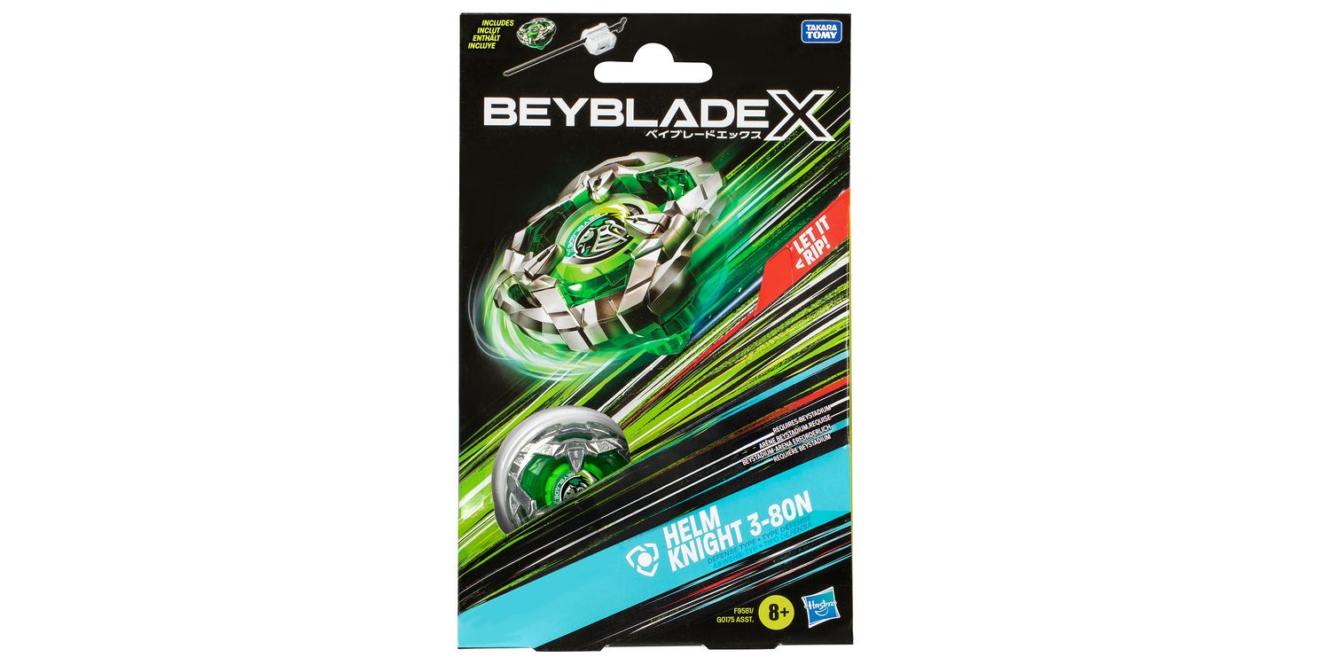 Experience the thrill of the next generation of Beyblade stadiums, launchers and tops: Beyblade X with the Beyblade X Helm Knight 3-80N Starter Pack which includes 1 right-spinning Defense Type top and launcher (Beystadium required, sold separately). Launch right into battle or reconfigure the interchangeable blade, ratchet, and bit of this Starter Pack with those of other Beyblade X tops (sold separately) to create your own unsurpassable Bey. Beyblade X features the X-Celerator Gear System innovation to level-up your game. When the gear of a Beyblade X top engages the rail of the Beystadium arena, it can super-accelerate into an Xtreme Dash rocketing it around the stadium for crushing collisions and epic bursts. Bladers launch their tops into fierce clashes against their opponent’s scoring points with each confrontation – first to score 4 points wins. Hasbro Beyblade toys with authentic Takara Tomy die-cast metal tops make great kids gifts for boys and girls ages 8 and up.