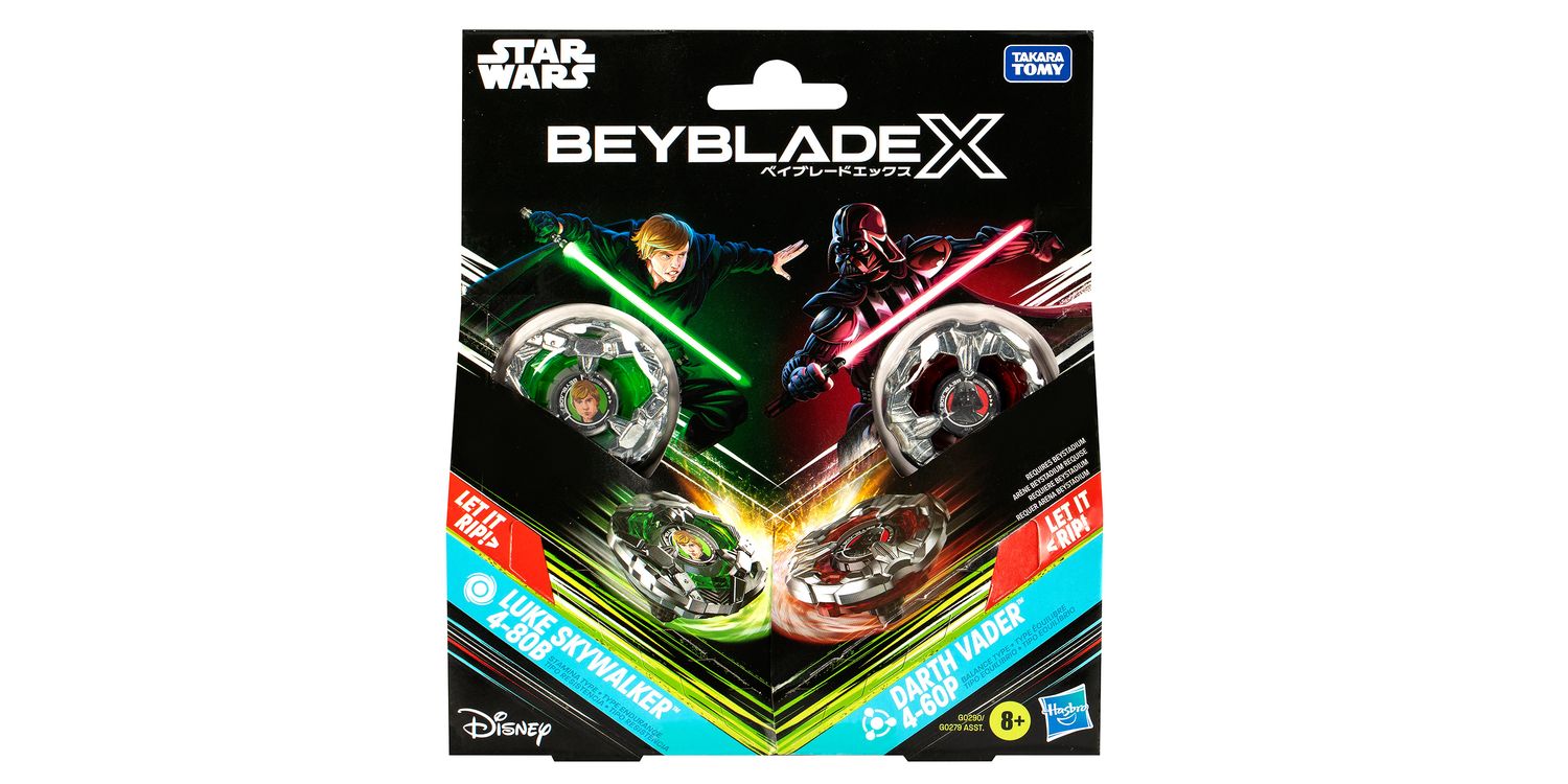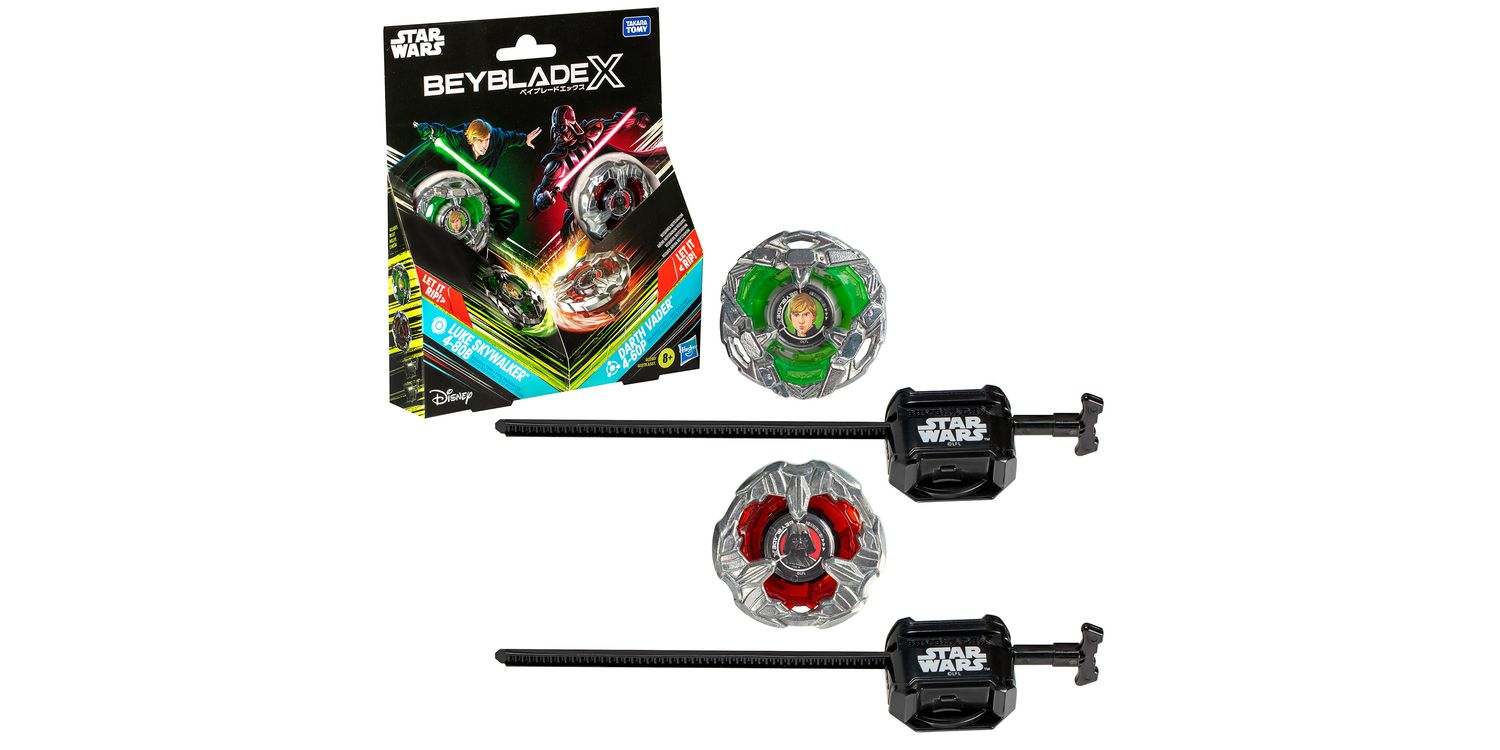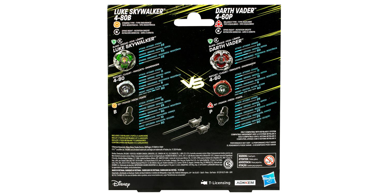Experience the thrill of the next generation of Beyblade stadiums, launchers and tops: Beyblade X with the Beyblade X and Star Wars Collab Luke Skywalker 4-80B and Darth Vader 4-60B Multipack Set which includes 2 right-spinning tops and 2 launchers (Beystadium required, sold separately). Launch right into battle or reconfigure the interchangeable blade, ratchet, and bit of tops in this Star Wars Collab Multipack with those of other Beyblade X tops (sold separately) to create your own unsurpassable Bey. Beyblade X features the X-Celerator Gear System innovation to level-up your game. When the gear of a Beyblade X top engages the rail of the Beystadium arena, it can super-accelerate into an Xtreme Dash rocketing it around the stadium. Bladers launch their tops into fierce clashes against their opponent’s scoring points with each spin – first to score 4 points wins. Hasbro Beyblade toys with authentic Takara Tomy die-cast metal tops make great kids gifts for boys and girls ages 8 and up.