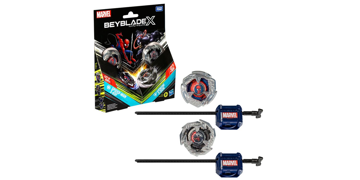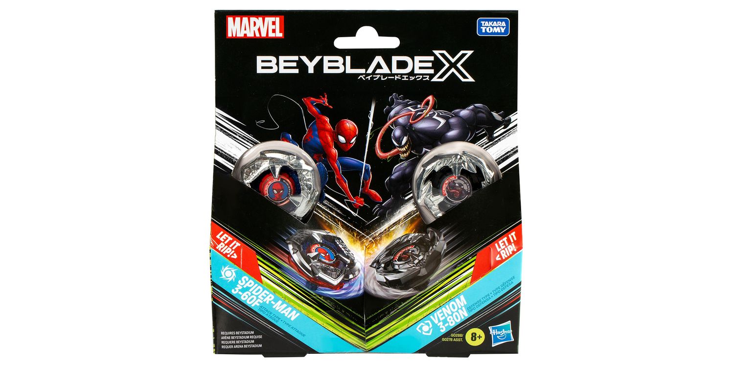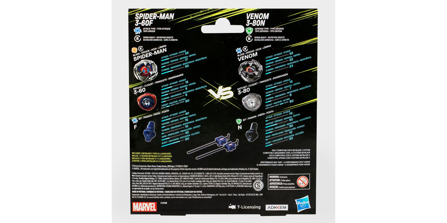 Experience the thrill of the next generation of Beyblade stadiums, launchers and tops: Beyblade X with the Beyblade X Marvel Collab Spider-Man 3-60F and Venom 3-80N Multipack Set which includes 2 right-spinning tops and 2 launchers (Beystadium required, sold separately). Launch right into battle or reconfigure the interchangeable blade, ratchet, and bit of tops in this Marvel Collab Multipack with those of other Beyblade X tops (sold separately) to create your own unsurpassable Bey. Beyblade X features the X-Celerator Gear System innovation to level-up your game. When the gear of a Beyblade X top engages the rail of the Beystadium arena, it can super-accelerate into an Xtreme Dash rocketing it around the stadium. Bladers launch their tops into fierce clashes against their opponent’s scoring points with each spin – first to score 4 points wins. Hasbro Beyblade toys with authentic Takara Tomy die-cast metal tops make great kids gifts for boys and girls ages 8 and up.