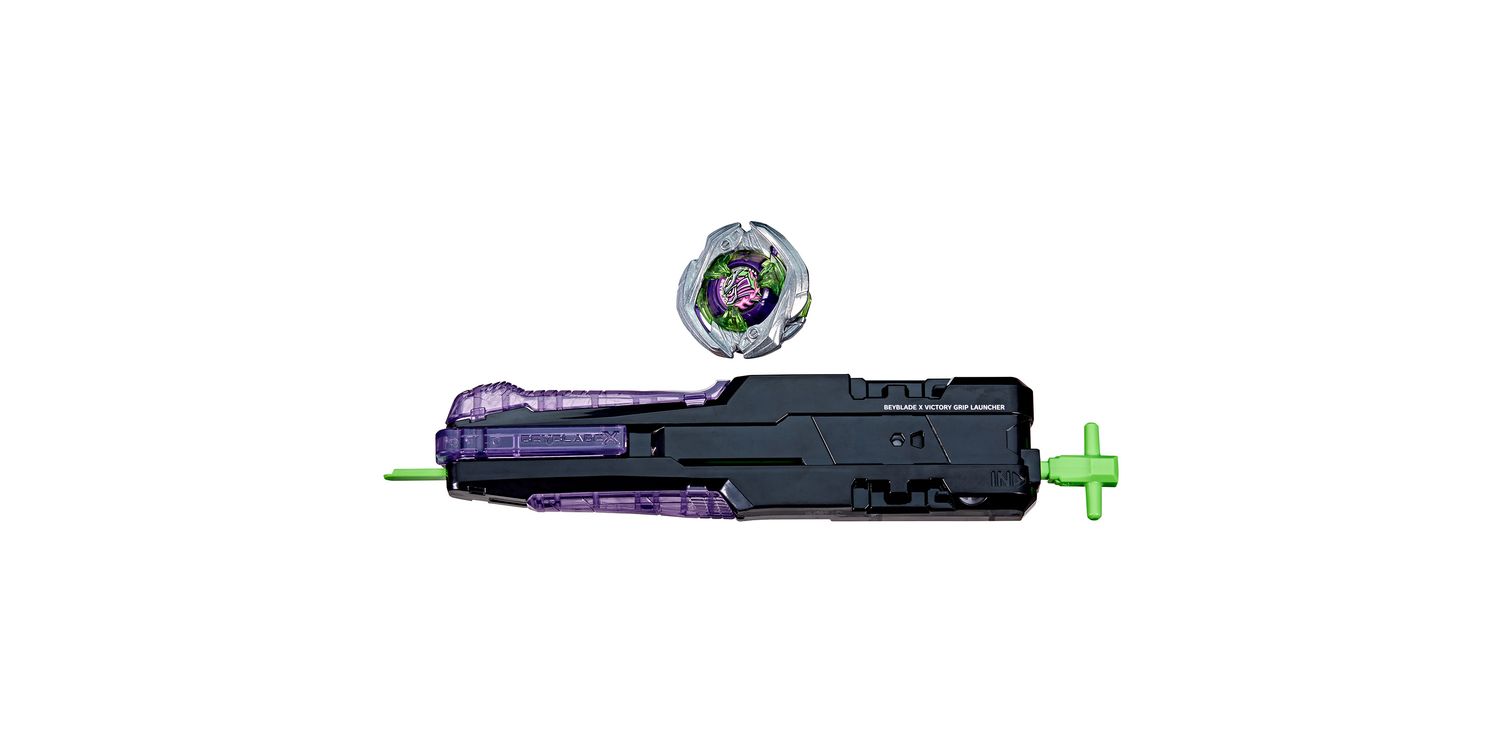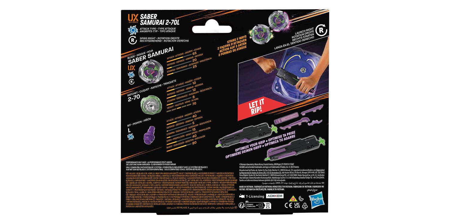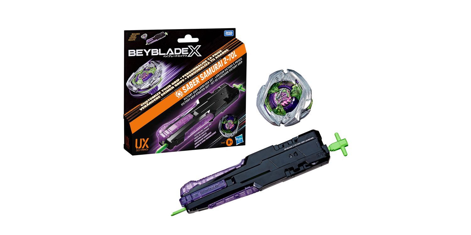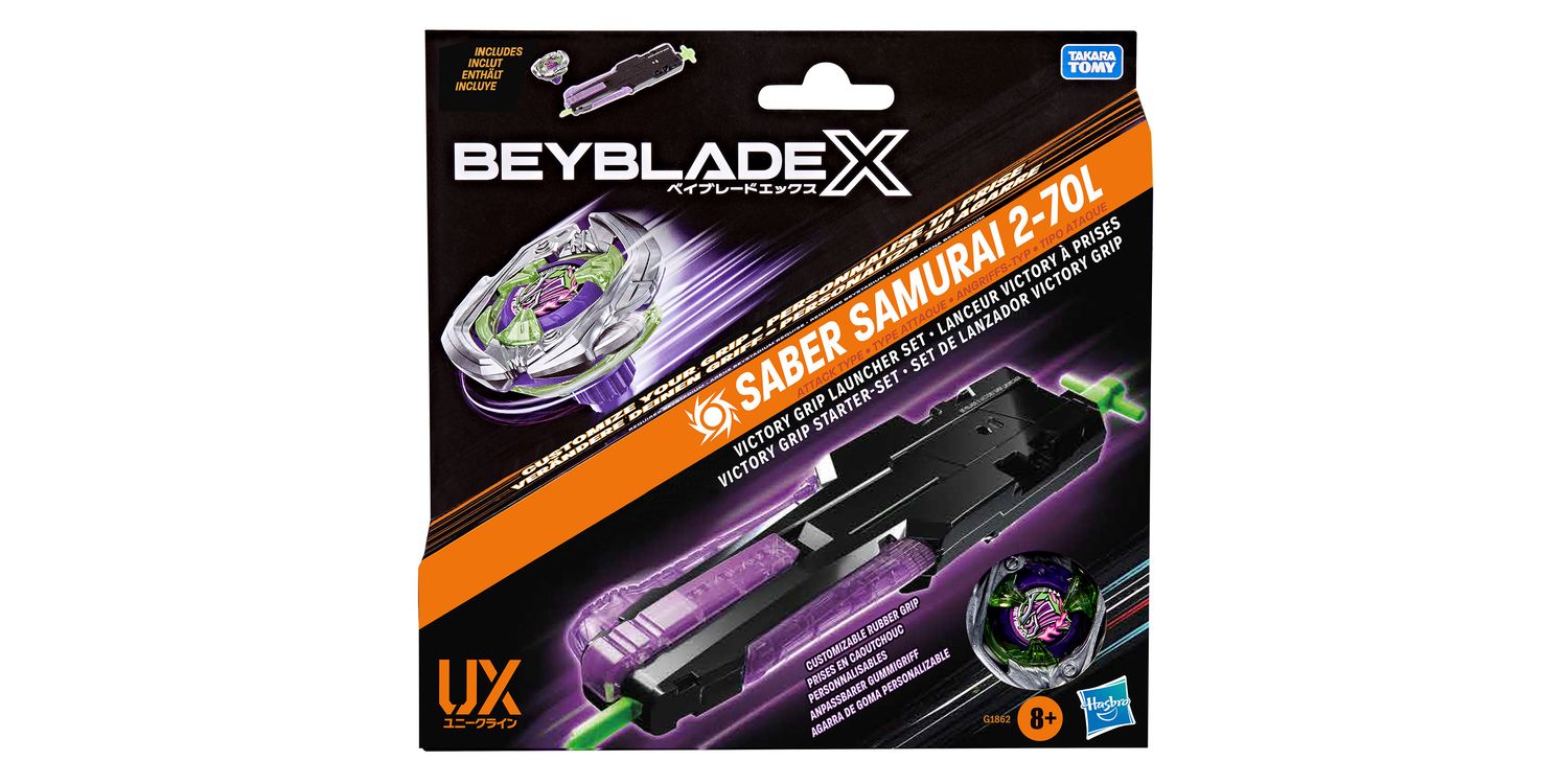 Experience Beyblade X, the next generation of Beyblade stadiums, launchers, and tops! The Victory Grip Launcher Set includes a right-spin launcher with a 10" (25cm) ripcord and customizable rubber grips. It comes with the Saber Samurai 2-70L Right-Spin Attack Type top, which works with the X-Celerator Gear System to level up your game and prove it in battle! When the top’s gear engages the X-Celerator Rail of a Beyblade X Beystadium (sold separately), it can super-accelerate into an Xtreme Dash around the arena for crushing collisions and epic bursts. Bladers launch their top against their opponent’s top to score points – first to 4 points wins. Mix and match the interchangeable blade, ratchet, and bit with those of other Beyblade X tops (sold separately) to create your own unsurpassable Bey.