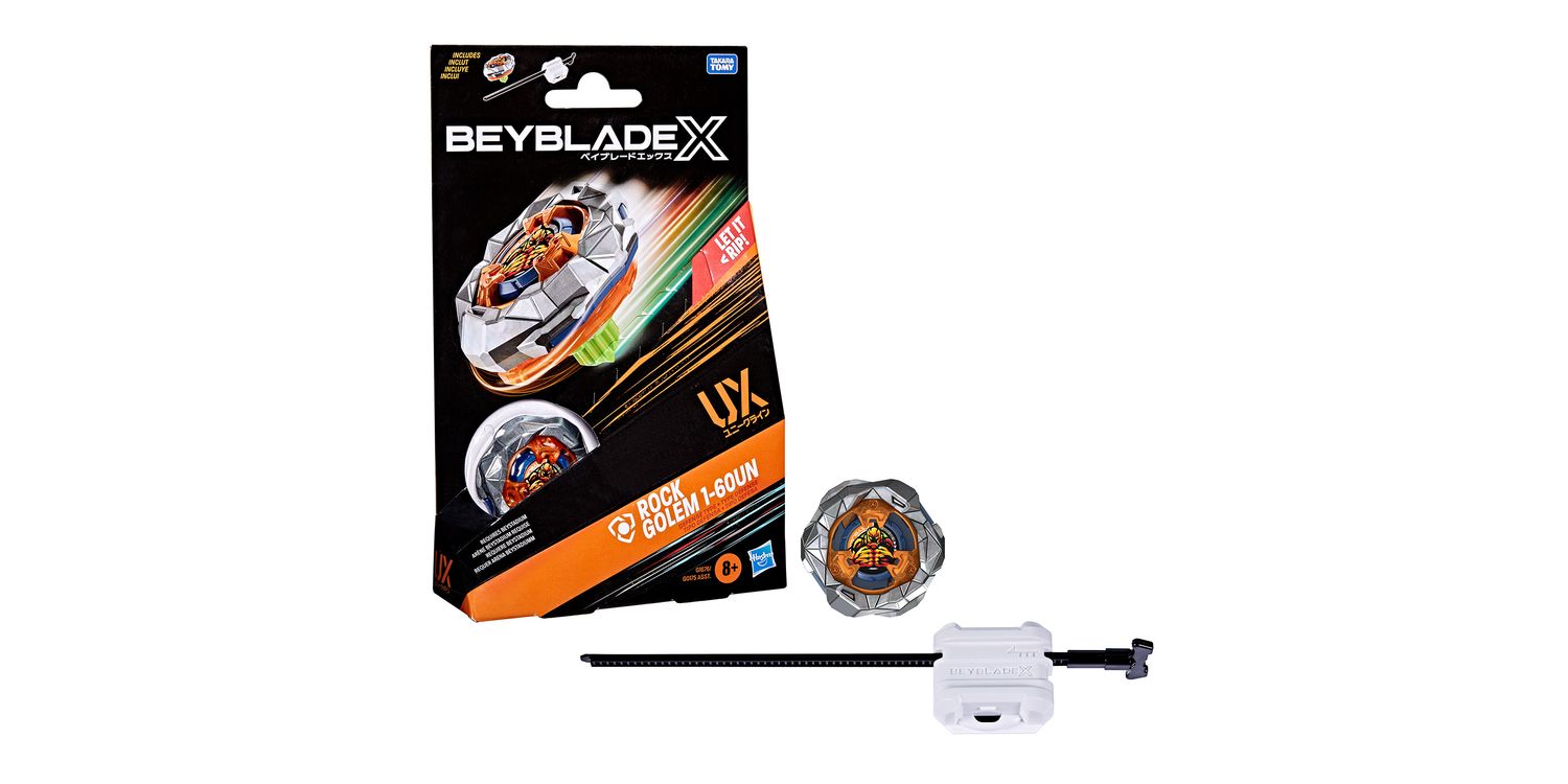 Experience the thrill of Beyblade X, the next generation of Beyblade stadiums, launchers and tops. The Beyblade X Rock Golem 1-60UN UX Starter Pack includes 1 right-spinning Stamina Type top with a Stamina Type Blade and launcher (Beystadium required, sold separately). Launch right into battle or reconfigure the interchangeable blade, ratchet, and bit of this Starter Pack with those of other Beyblade X tops (sold separately) to build your perfect Beyblade top. Beyblade X features the X-Celerator Gear System innovation to level-up your game. When the gear of a Beyblade X top engages the rail of the Beystadium arena, it can superaccelerate into an Xtreme Dash around the stadium for crushing collisions and epic bursts. Bladers launch their tops into fierce clashes against their opponent’s to score points.