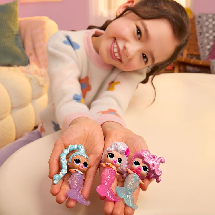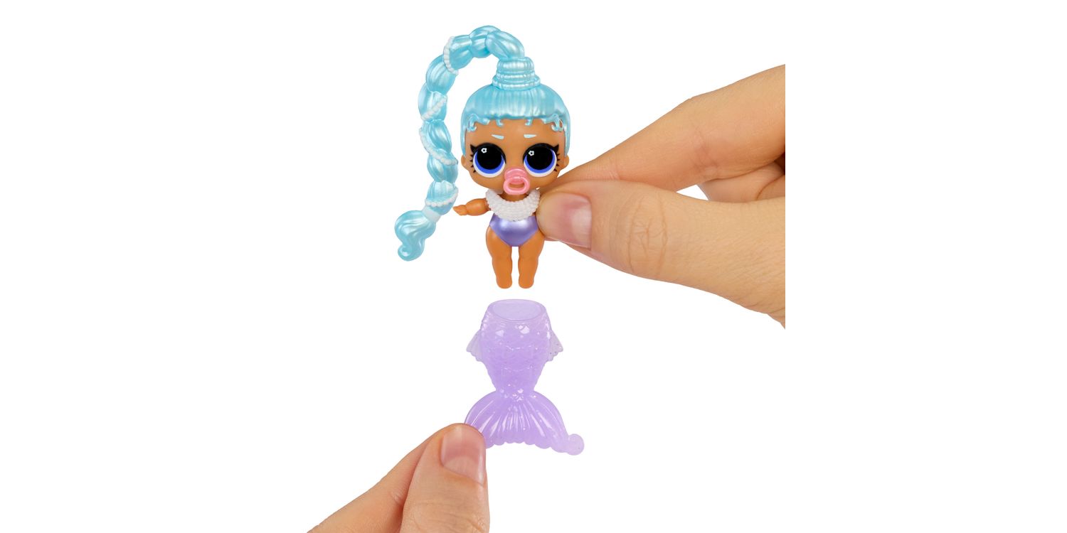Transform your Baby Sister by putting on her beautiful mermaid tail and dive into waves of magical fun. Each Baby Sister Doll comes with a removable fin that can transform into an adorable mini mermaid! Fill ice water into her clamshell. Then, dip the tail in the water to reveal a dazzling colour-change surprise right before your eyes - watch the scales change colour as the water brings the magic to life! Every doll also comes with her own shell-inspired ball that doubles as a display, complete with a stand so you can showcase your mermaid in style. Perfect for both play and display, the Makeover Magic Baby Sisters are the perfect companions to the L.O.L. Surprise Mermaids! Makeover Magic Tots™ (each sold separately). Meet all six adorable Baby Sisters in this shimmering sea collection - lil Splash queen, lil Coral Dream, lil Laguna Luxe, lil Island BB, lil Sun Kissed QT, lil SPF cutie - each featuring flowy new mermaid hair, vibrant tails, and splashy personalities. Will you discover the ultra-rare mermaid?
