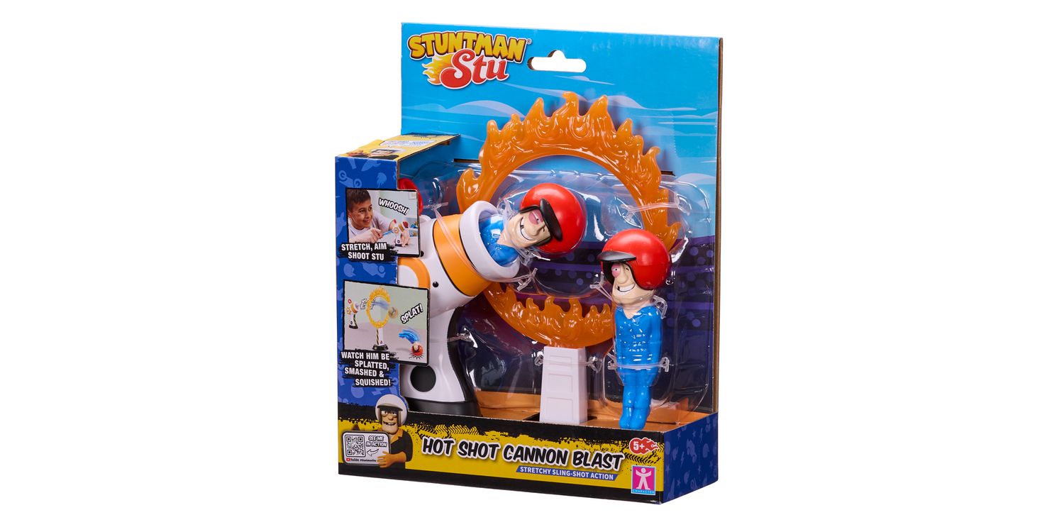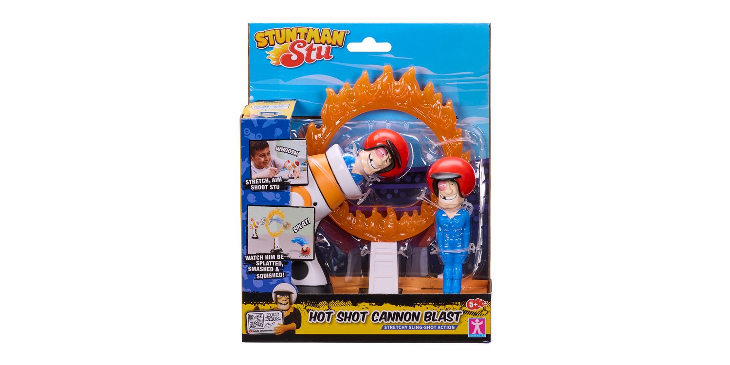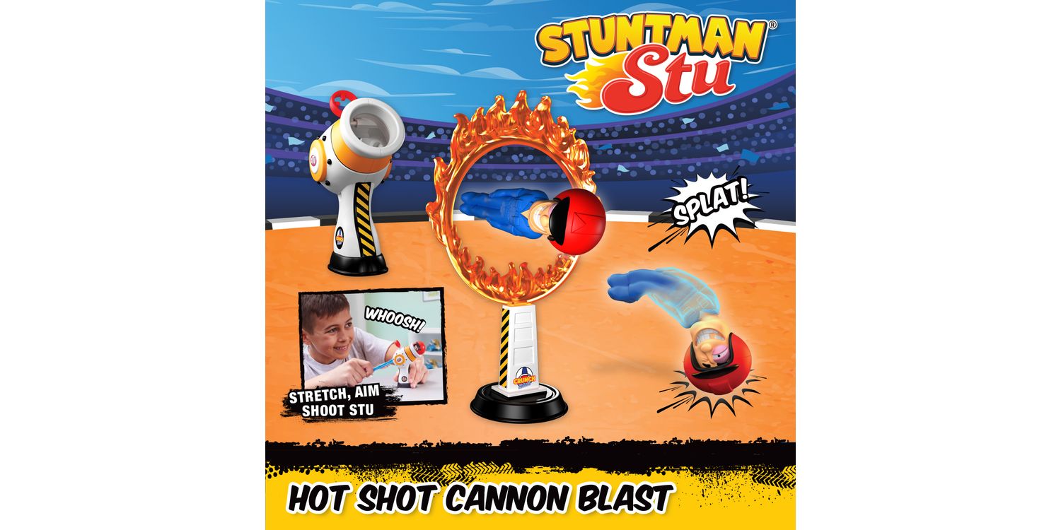 SLING SHOT ACTION Get ready for stretchy sling shot action with the Stuntman Stu Hot Shot Cannon Blast. Feel the heat of the ring as Stu goes head-to-head with the fiercely flaming Ring of Death! Will he be ‘Frying or Flying’ when you aim, shoot and fire!