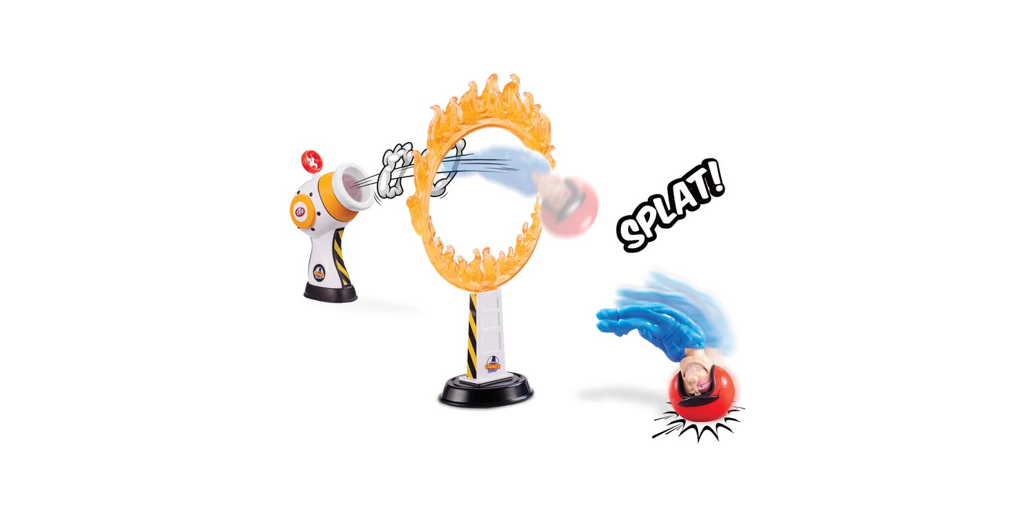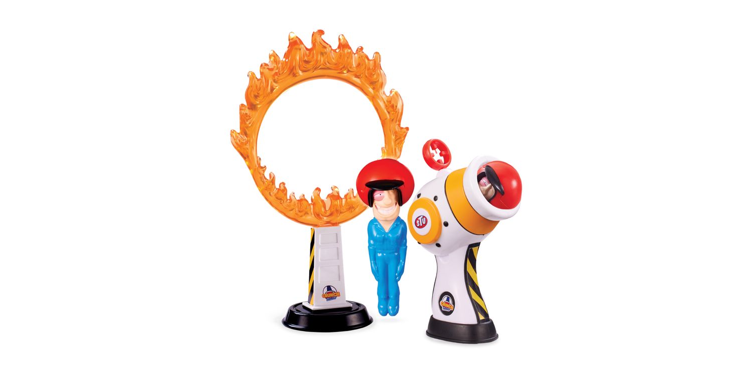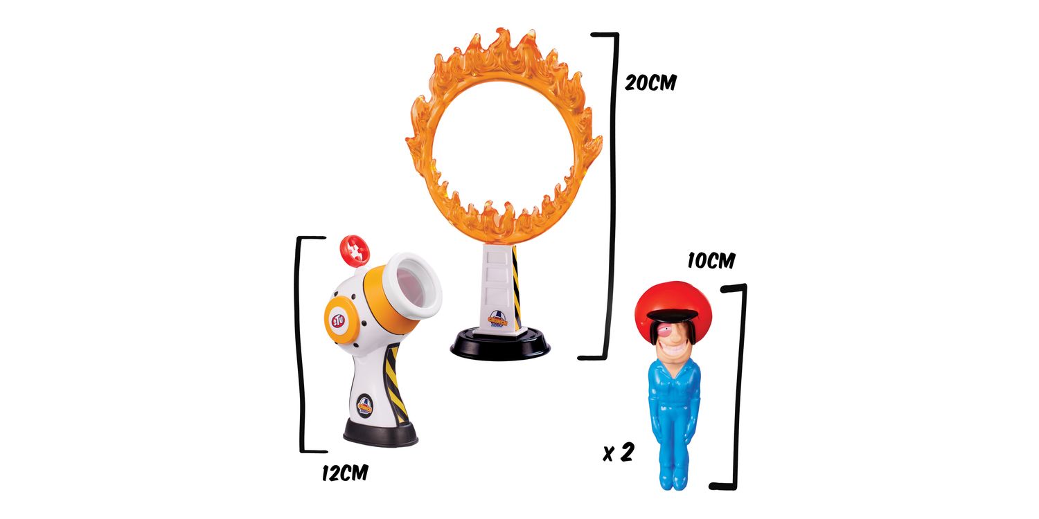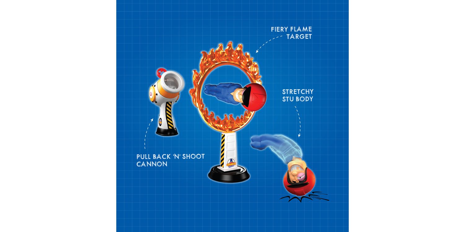 SLING SHOT ACTION Get ready for stretchy sling shot action with the Stuntman Stu Hot Shot Cannon Blast. Feel the heat of the ring as Stu goes head-to-head with the fiercely flaming Ring of Death! Will he be ‘Frying or Flying’ when you aim, shoot and fire!