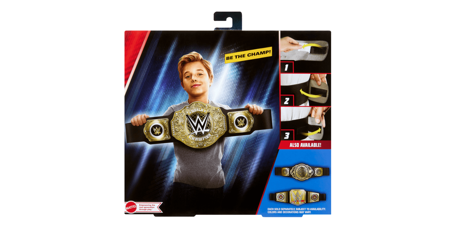 WWE Championship Titles let every kid in the WWE Universe become a champion! Play out favourite matches, then put on the championship and role-play the victories of WWE Superstars. The authentic-style title has a one-time adjustable belt (3+ ft long) that can strap around the waist of children ages 6 years or older. Colours and decorations may vary.