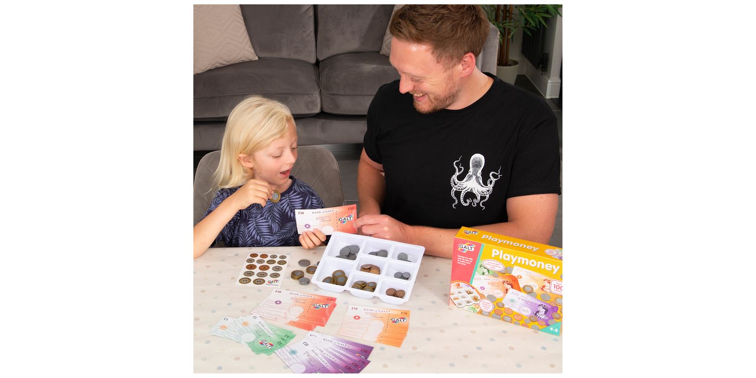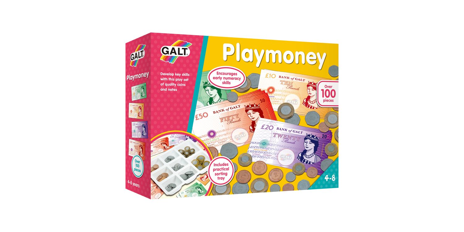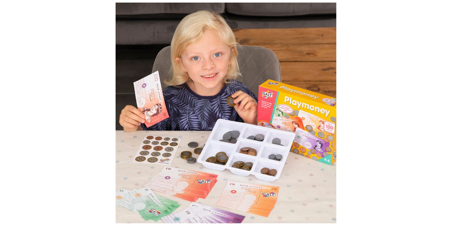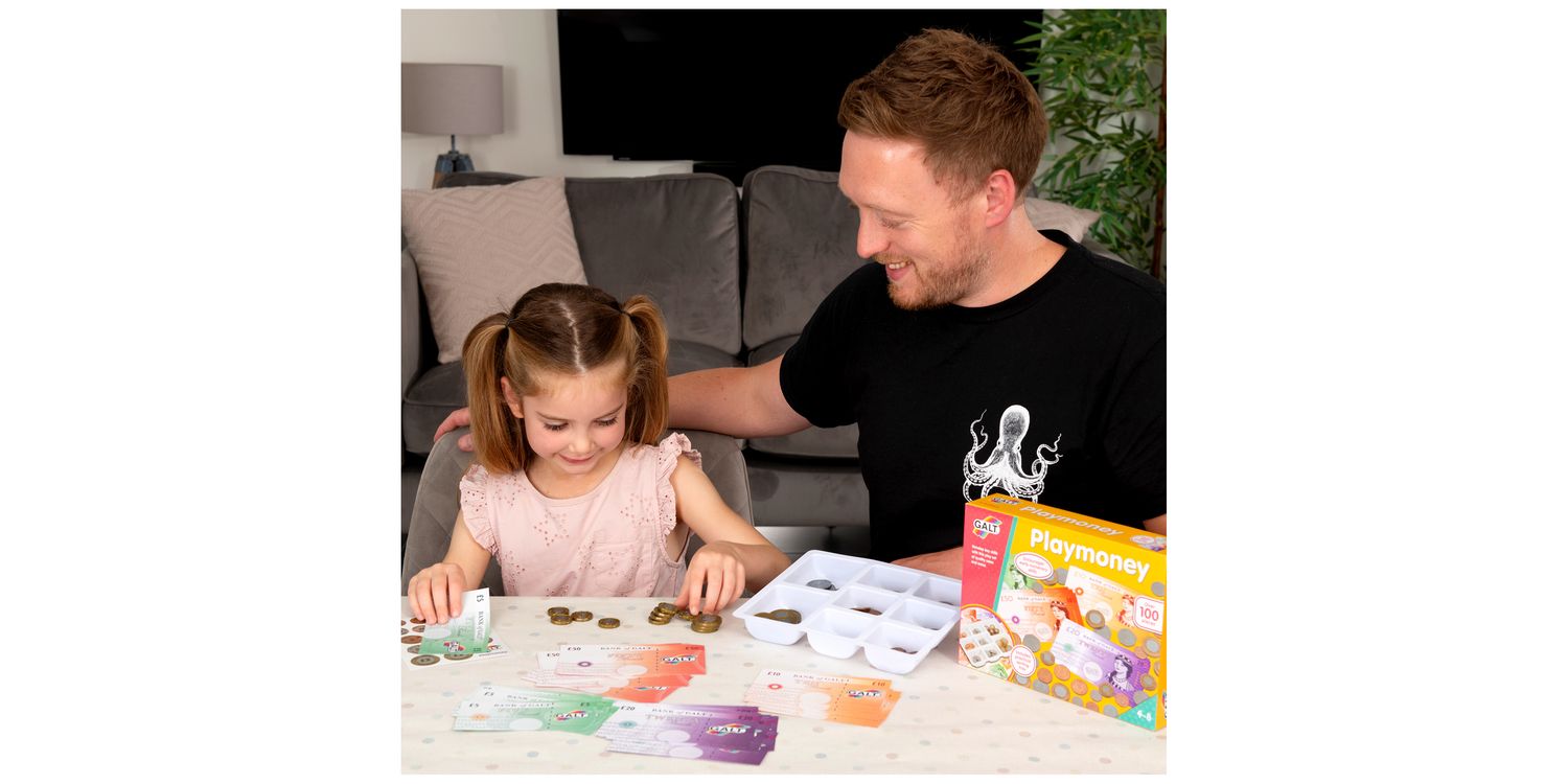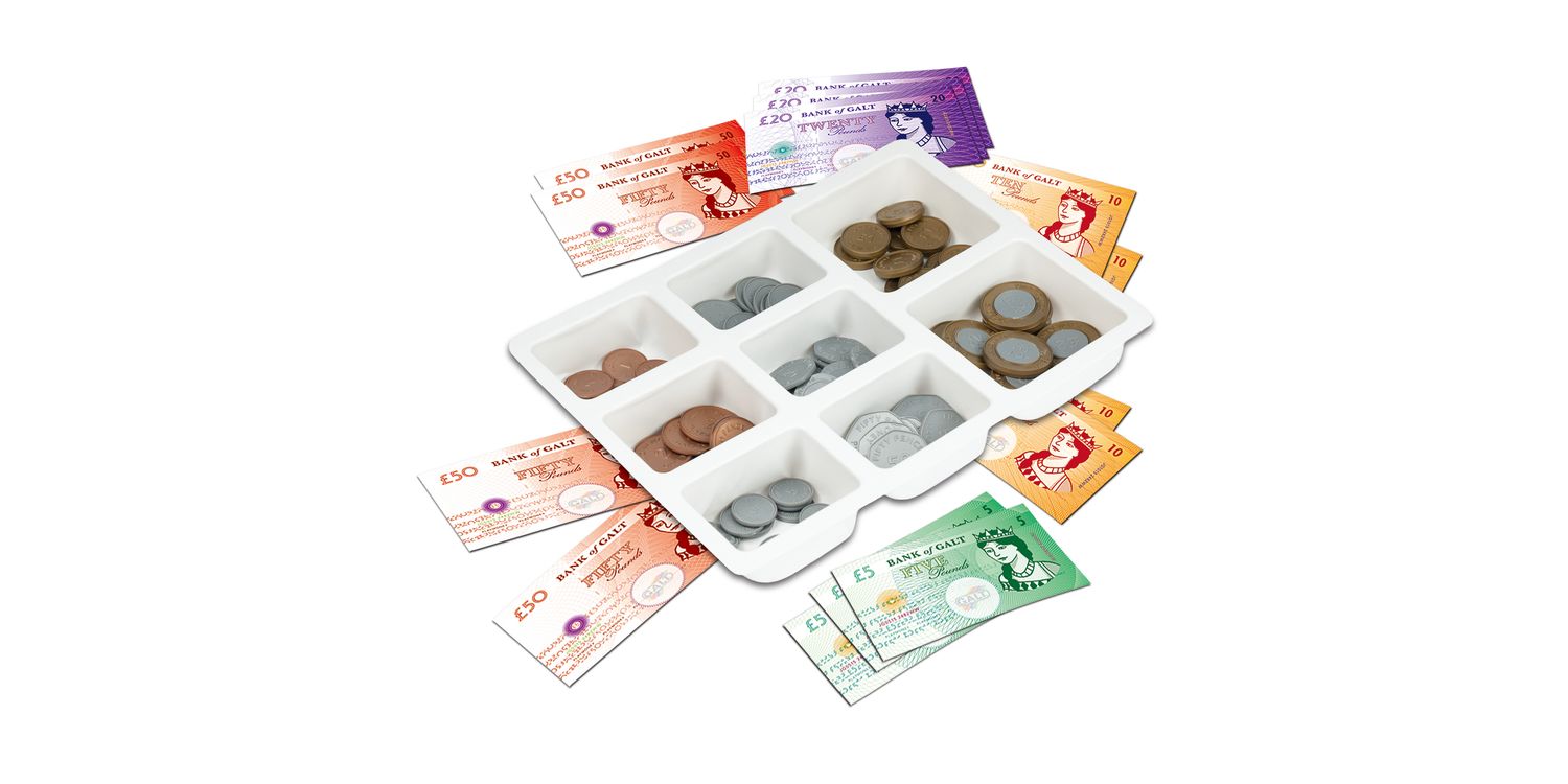 Contents: 10 each of 1p, 2p, 5p, 10p, 20p, 50p, £1 and £2 plastic coins, 6 each £5, £10, £20 and £50 double-sided notes, sorting tray, coin sticker sheet and play guide.
