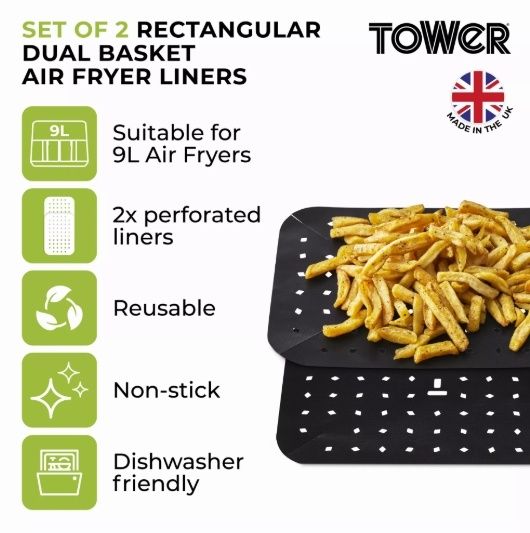 This pack of 2 air fryer liners is perfect for creating delicious meals, whilst ensuring your air fryer stays in pristine condition. Consisting of two black perforated liners they are excellent for promoting great air circulation, ensuring thorough and more even cooking. The liners can be used in the dishwasher for a fuss-free clean, although handwash is recommended to ensure the liners stay in immaculate condition. There is no need for one-use parchment paper as the liners can be washed and reused for a reduced environmental impacts pack of 2 air fryer liners is perfect for creating delicious meals, whilst ensuring your air fryer washed and reused for a reduced environmental impact