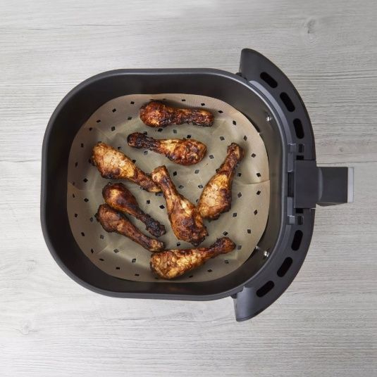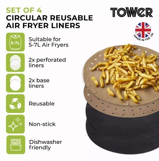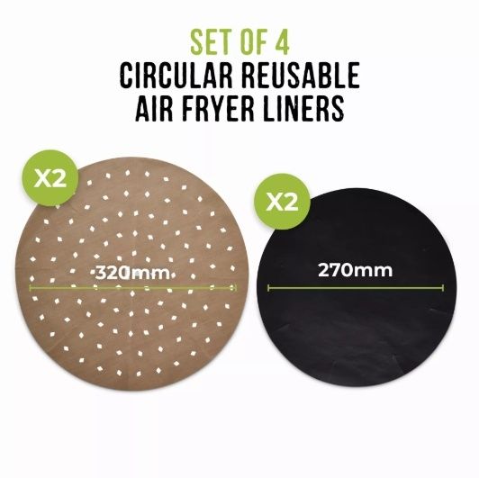 This pack of 4 air fryer liners is perfect for creating delicious meals, whilst ensuring your air fryer stays in pristine condition. Consisting of two gold perforated liners and two black base liners, they can be combined to great effect for more flavoursome meals. The perforated gold liner is excellent for promoting great air circulation, ensuring thorough and more even cooking, whilst the black liner fits comfortably underneath the grill plate, expertly catching grease and food residue to keep the air fryer clean. The liners can be used in the dishwasher for a fuss-free clean, although handwash is recommended to ensure the liners stay in immaculate condition. There is no need for one-use parchment paper as the liners can be washed and reused for a reduced environmental impact.