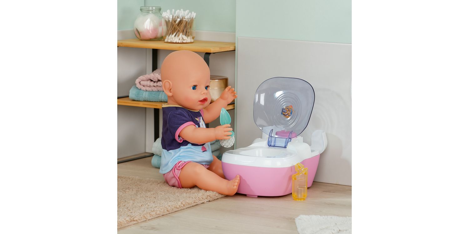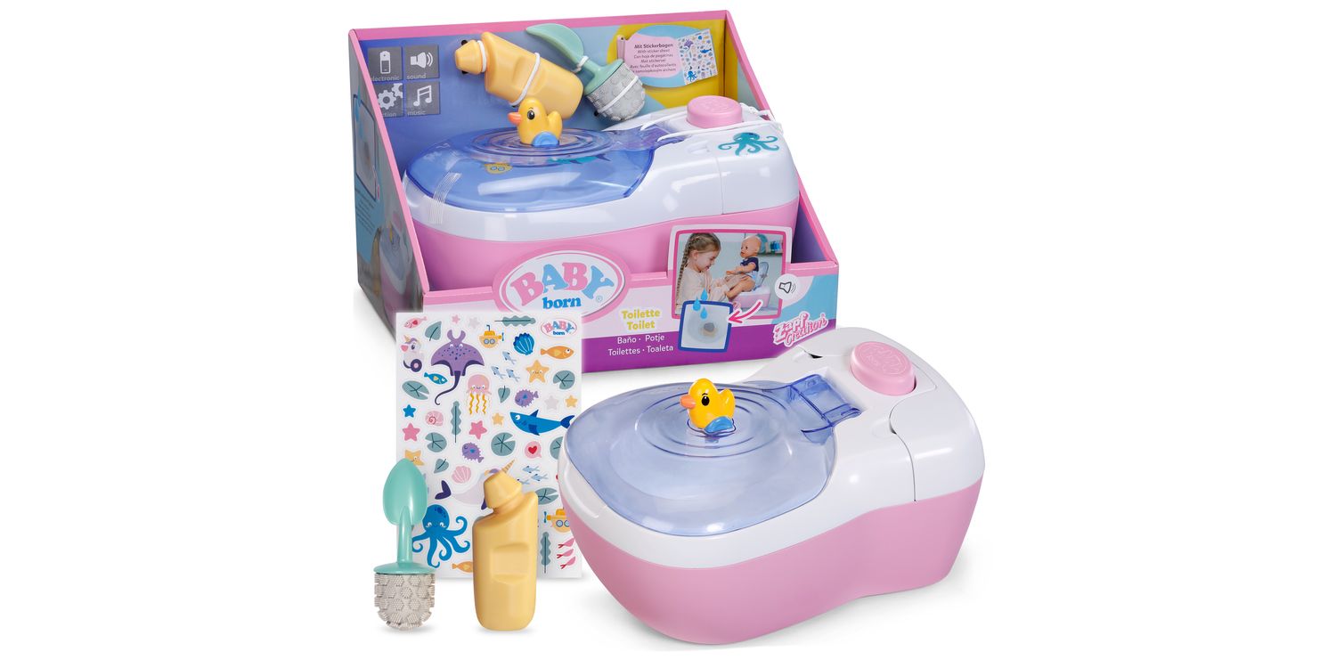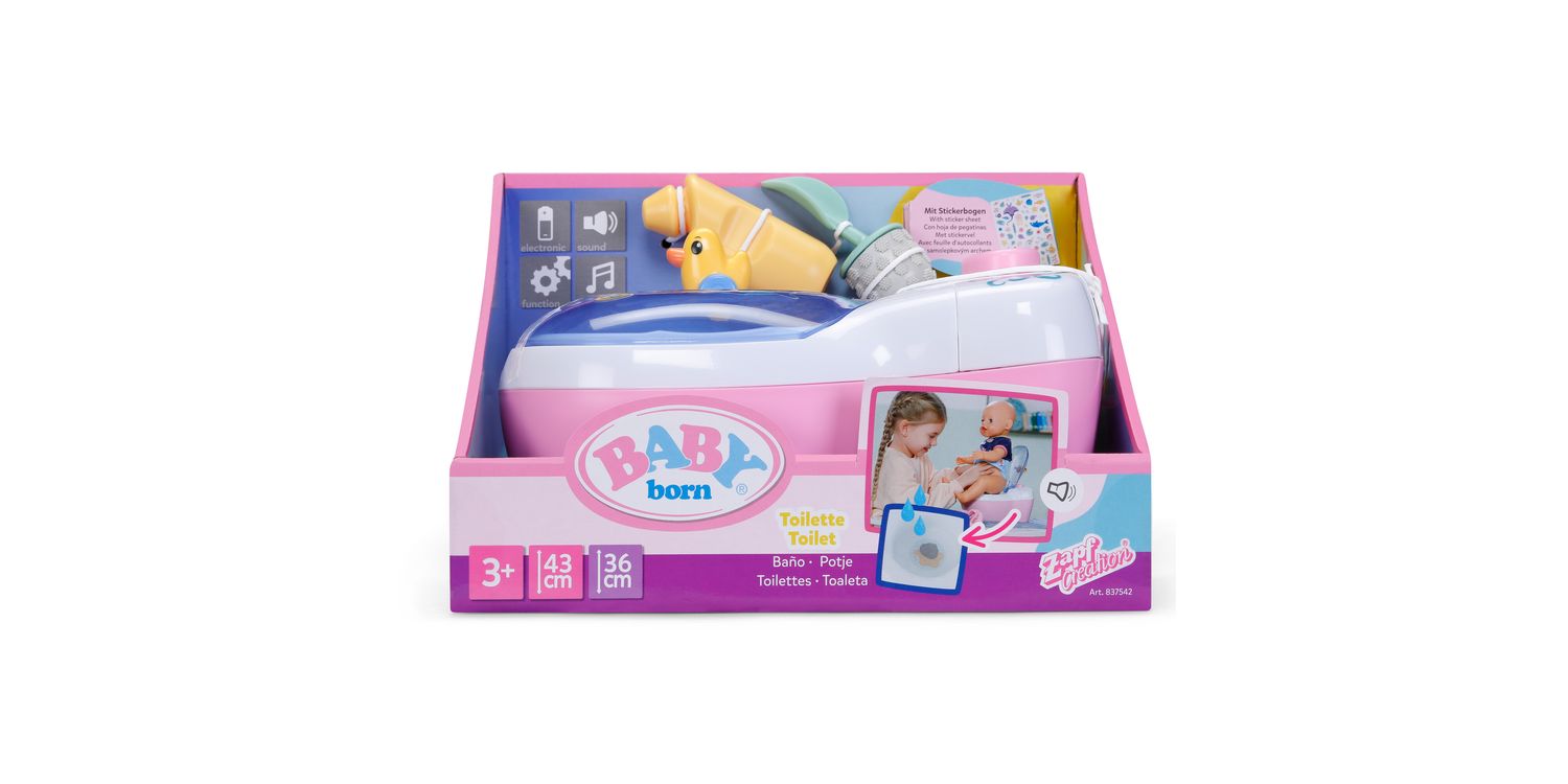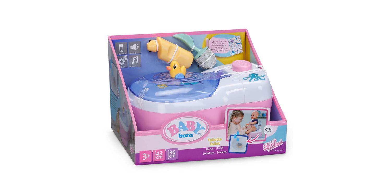 BABY born doll toilet with funny sounds, music and water-reveal feature. Includes matching cleaning accessories and a fun sticker sheet.