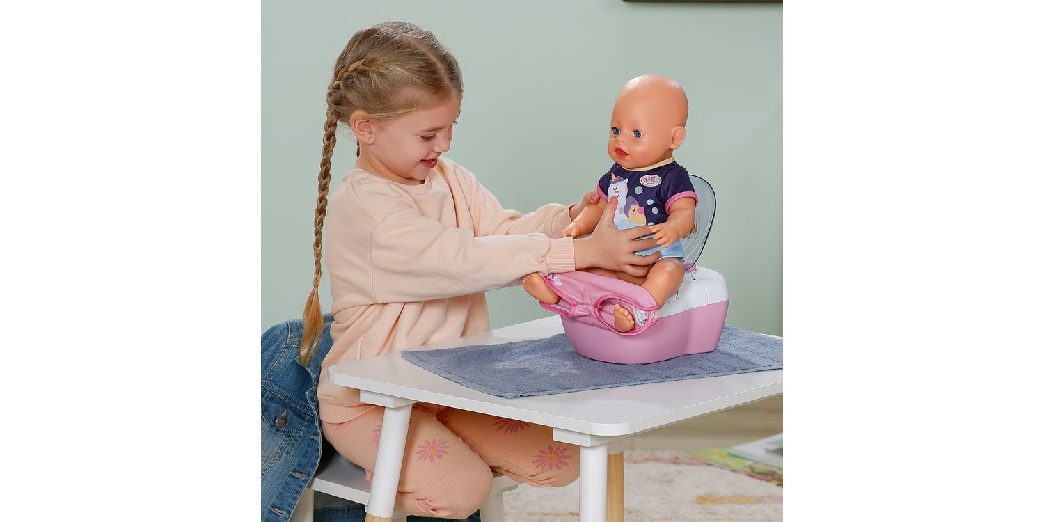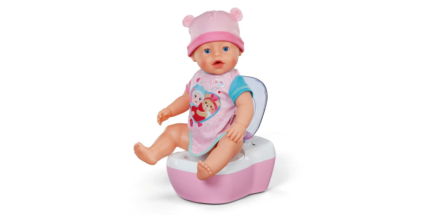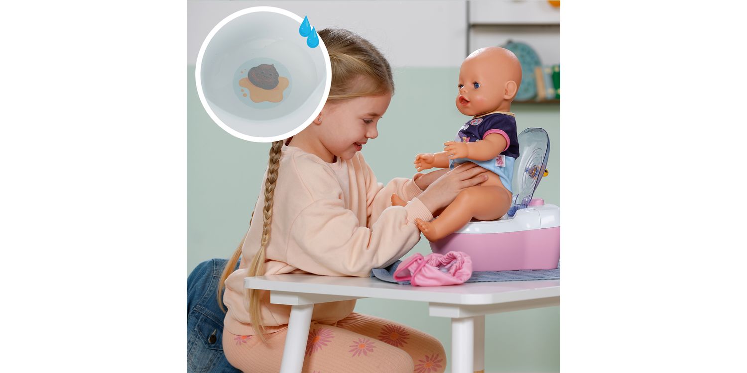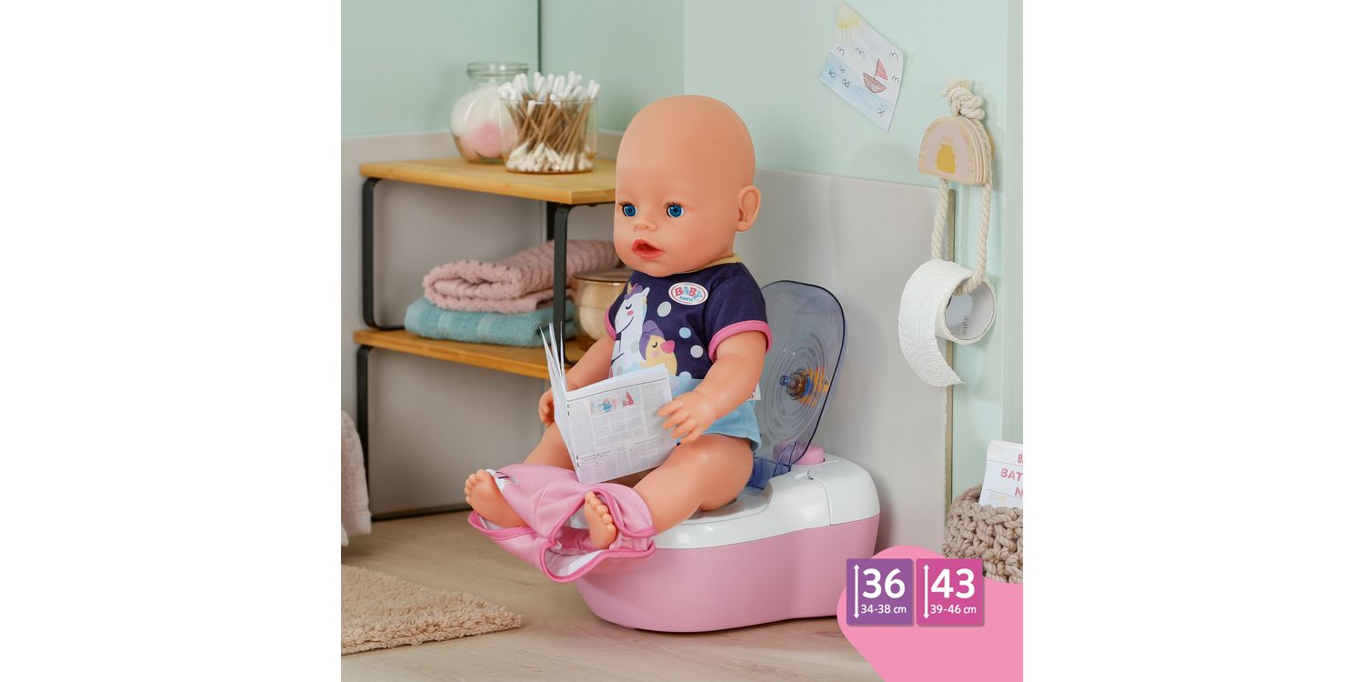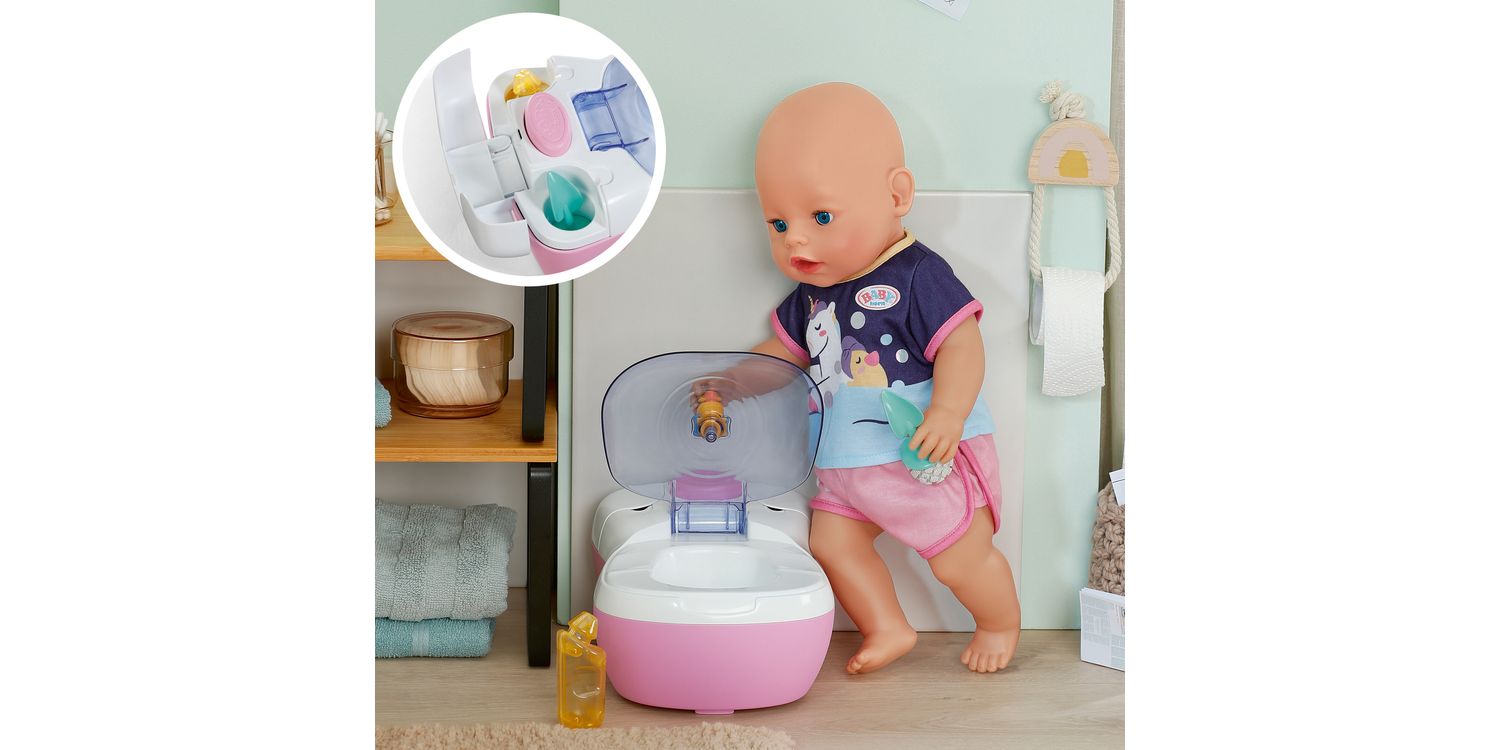 BABY born doll toilet with funny sounds, music and water-reveal feature. Includes matching cleaning accessories and a fun sticker sheet.