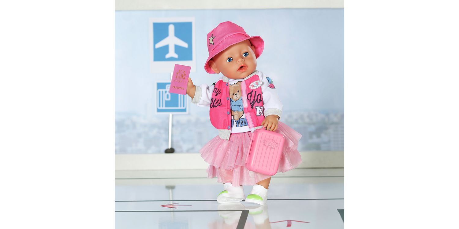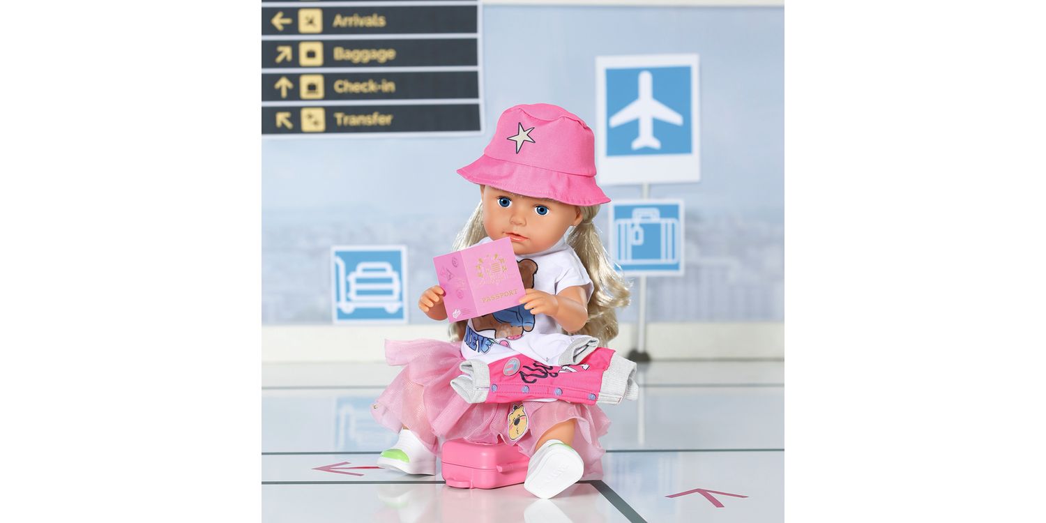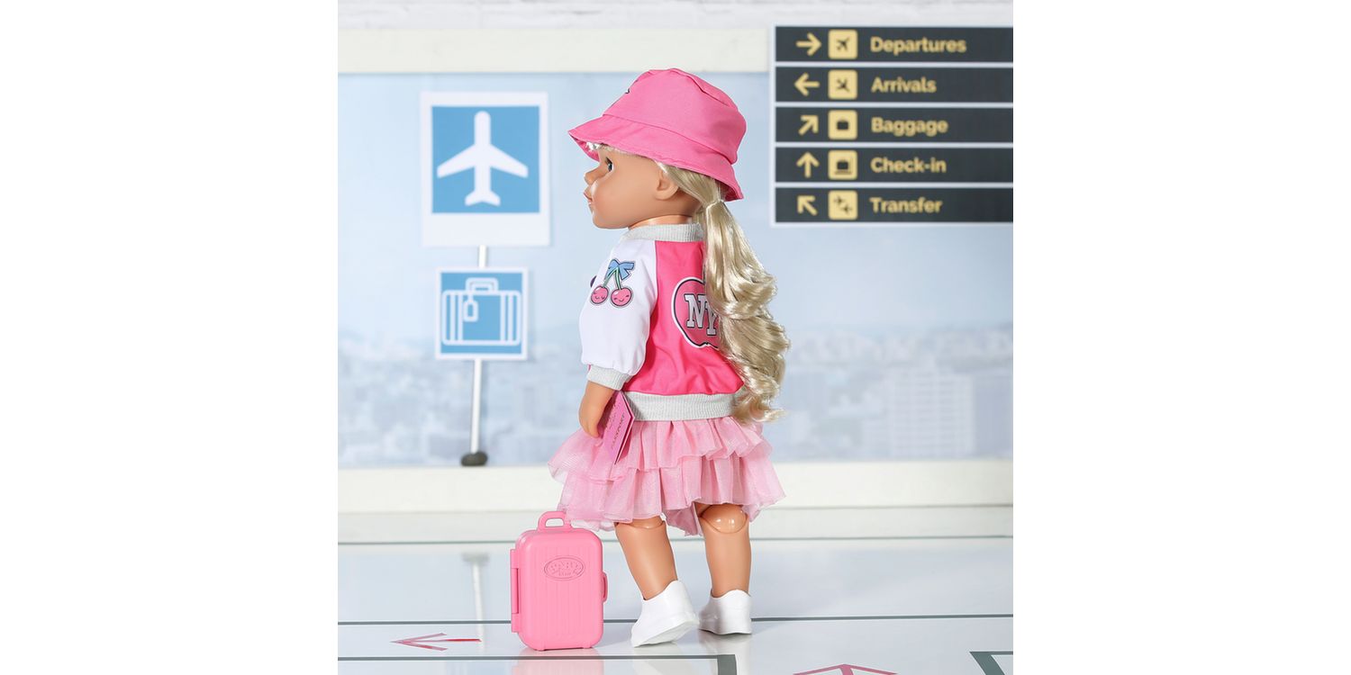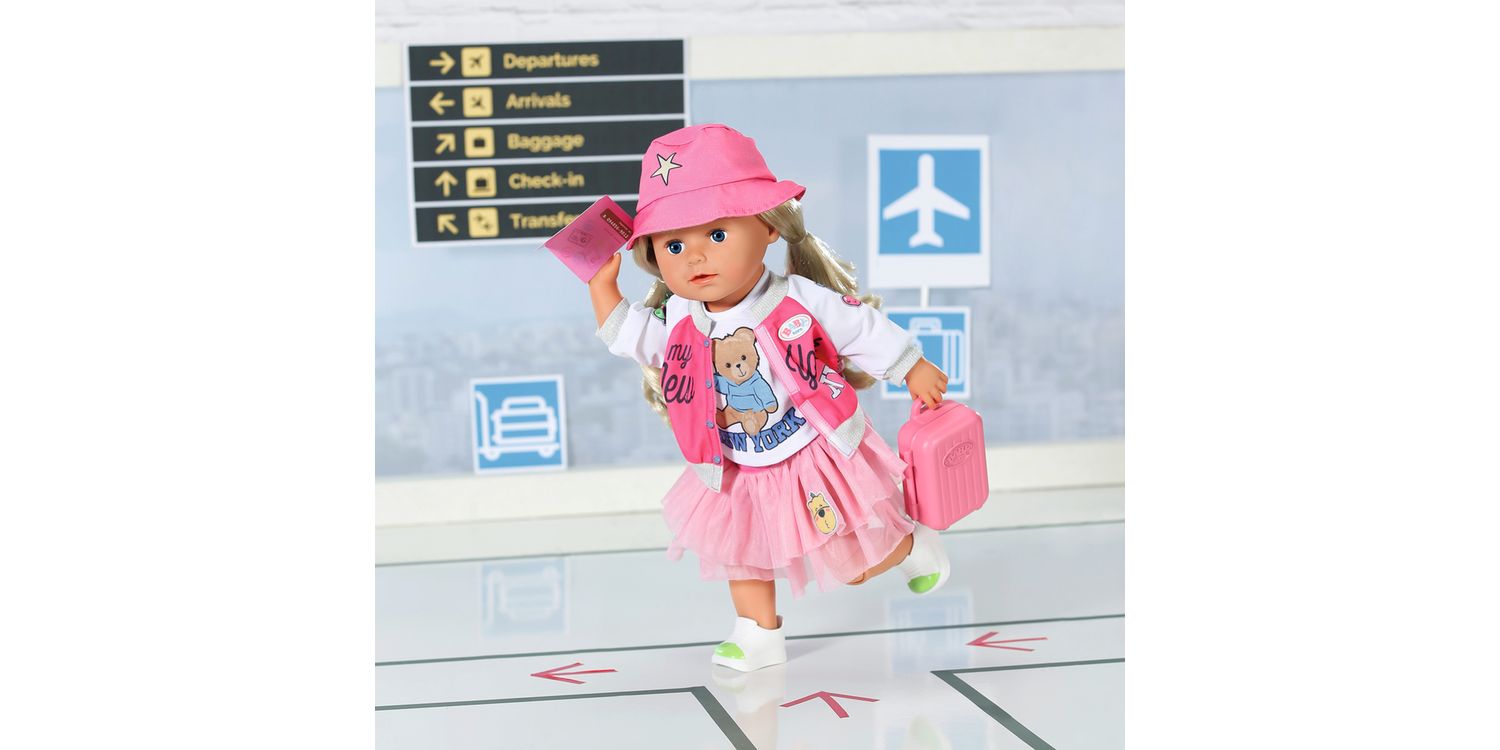 Travel the world in style with the BABY born Deluxe Travel outfit! Consisting of a bright, varsity-style jacket, a cute t-shirt, tulle skirt, shoes and hat your BABY born will be ready to jet off somewhere new. Each item co-ordinates perfectly, including the matching suitcase. Don’t forget your passport BABY born! BABY born Deluxe Travel 43cm – with bucket hat, varsity jacket, t-shirt, tutu skirt and trainers. Includes mini suitcase with wheels and a passport.