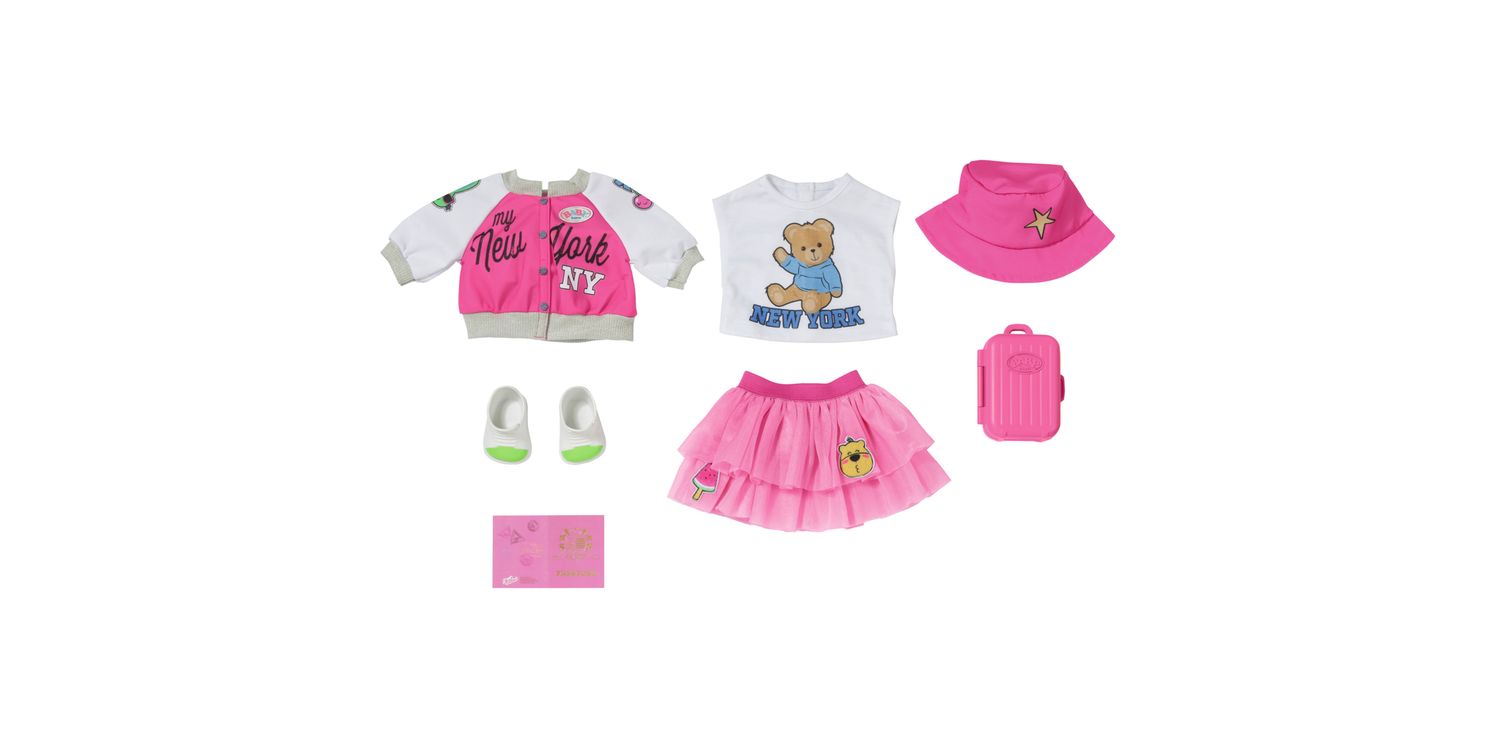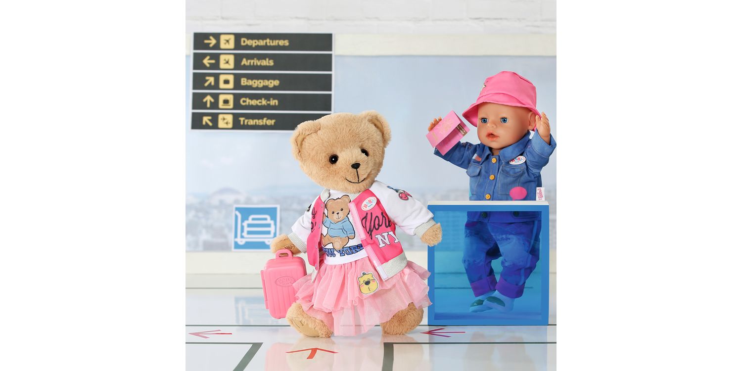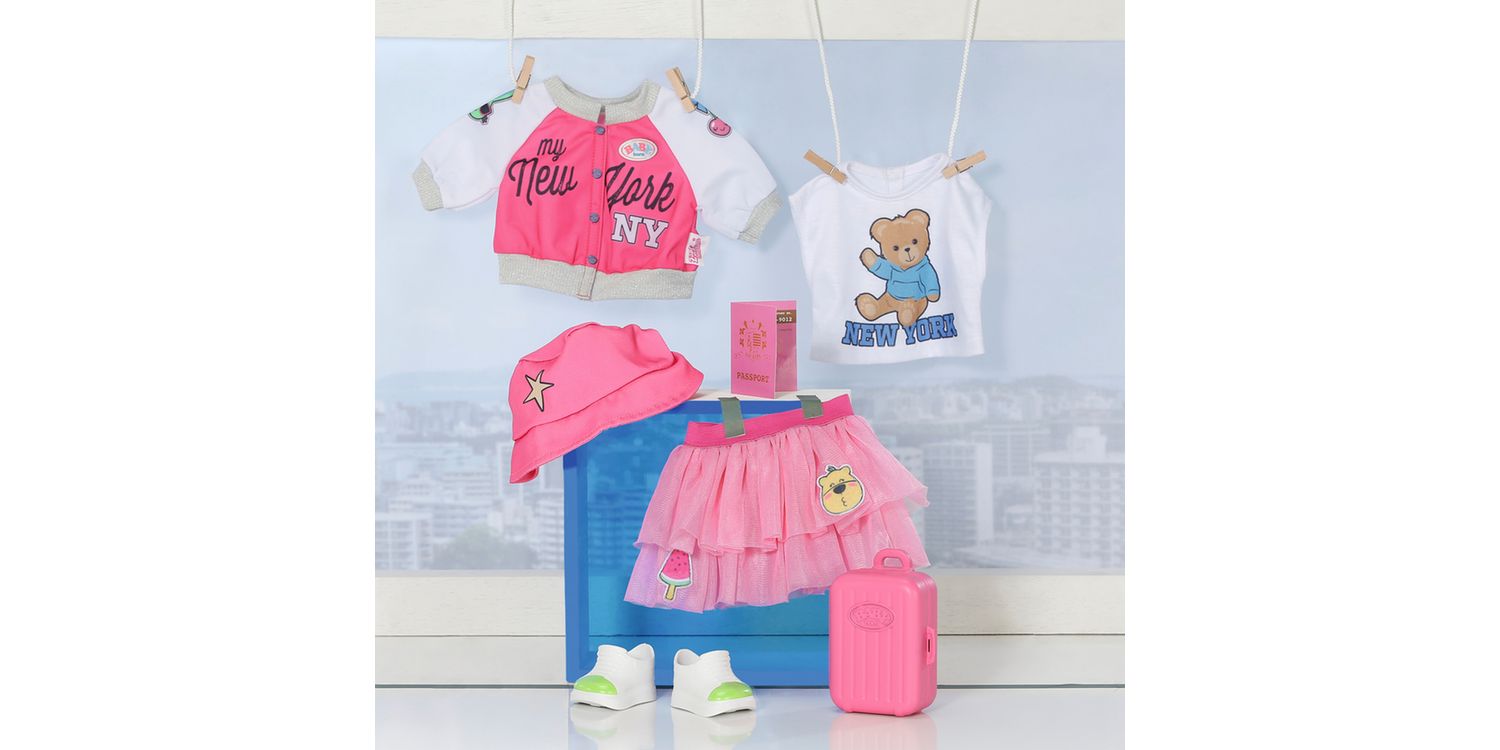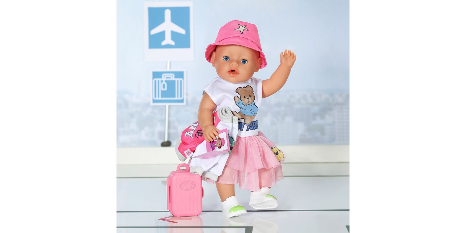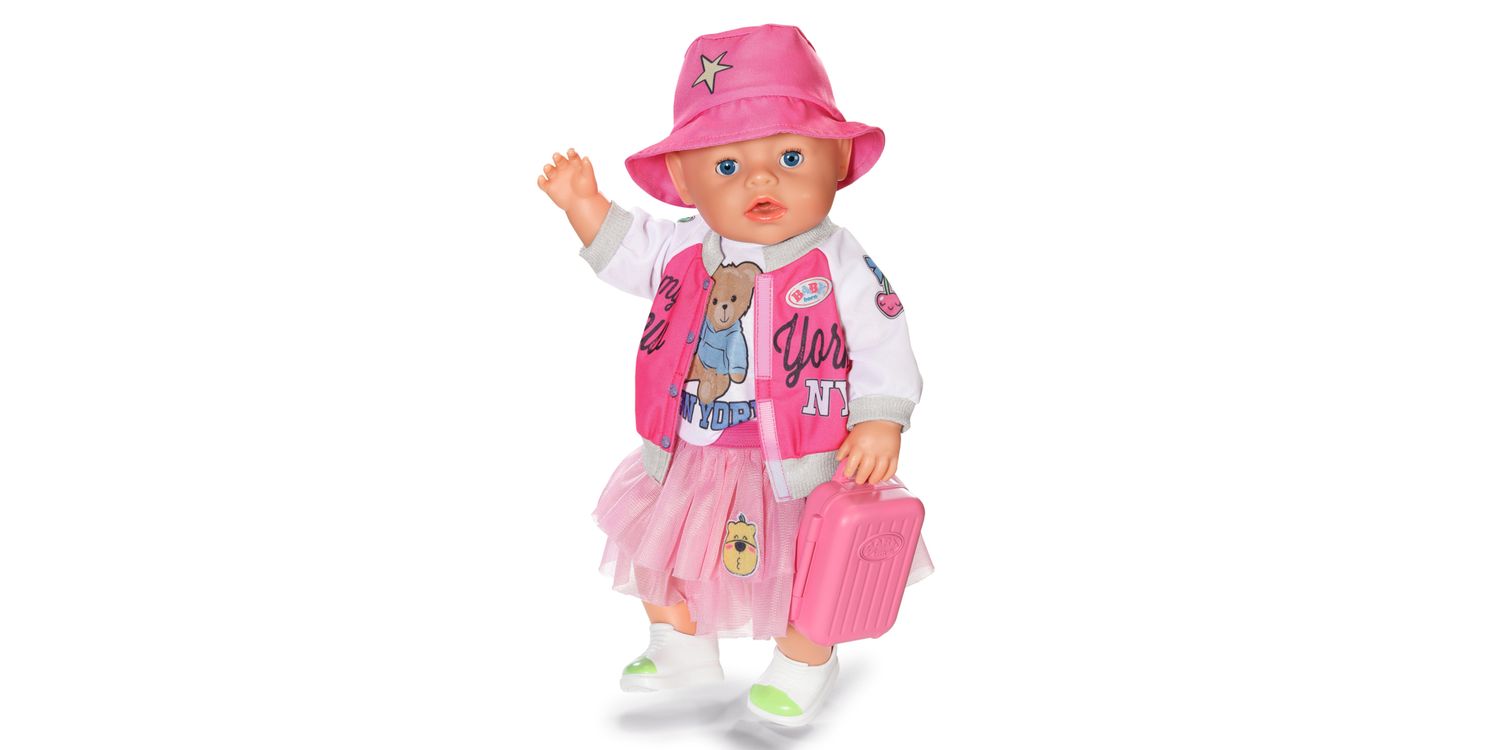 Travel the world in style with the BABY born Deluxe Travel outfit! Consisting of a bright, varsity-style jacket, a cute t-shirt, tulle skirt, shoes and hat your BABY born will be ready to jet off somewhere new. Each item co-ordinates perfectly, including the matching suitcase. Don’t forget your passport BABY born! BABY born Deluxe Travel 43cm – with bucket hat, varsity jacket, t-shirt, tutu skirt and trainers. Includes mini suitcase with wheels and a passport.