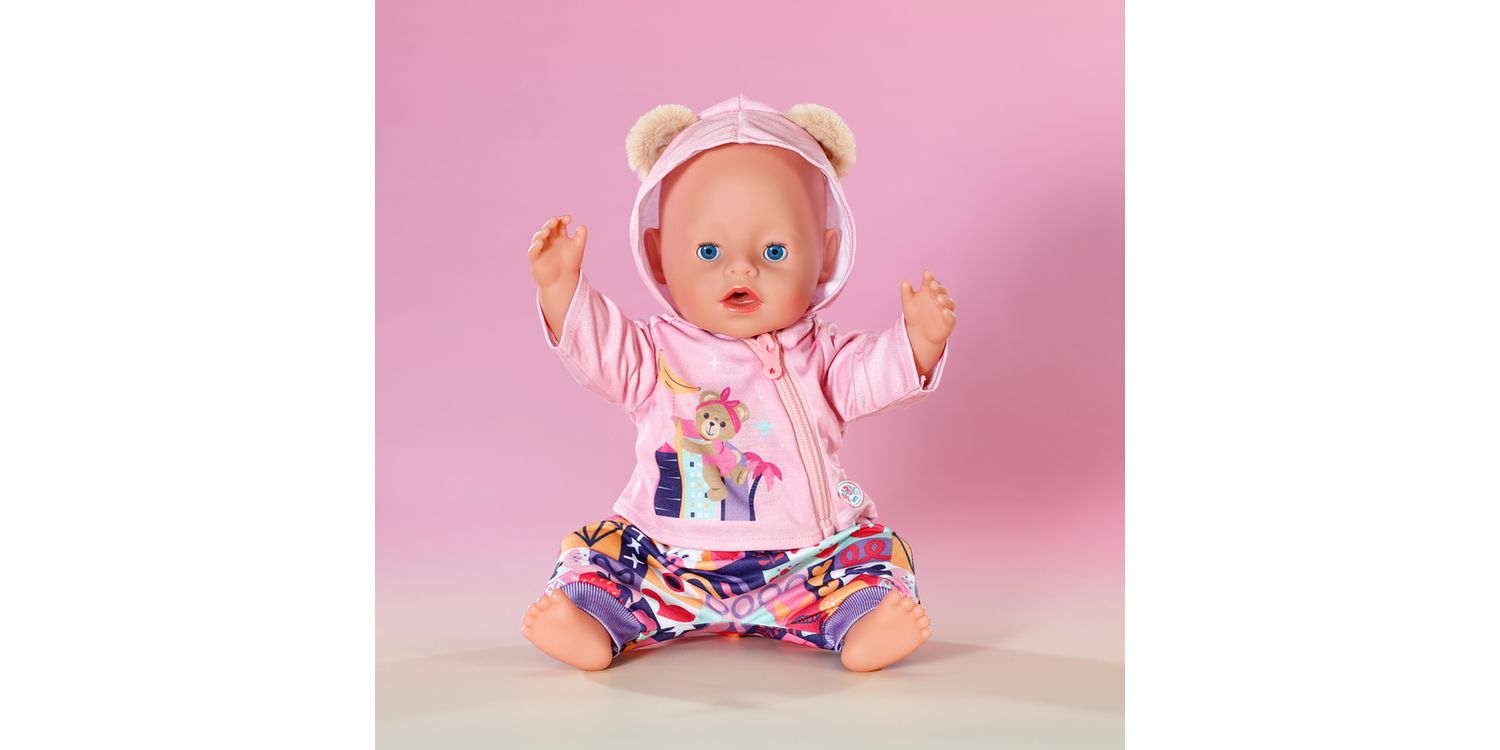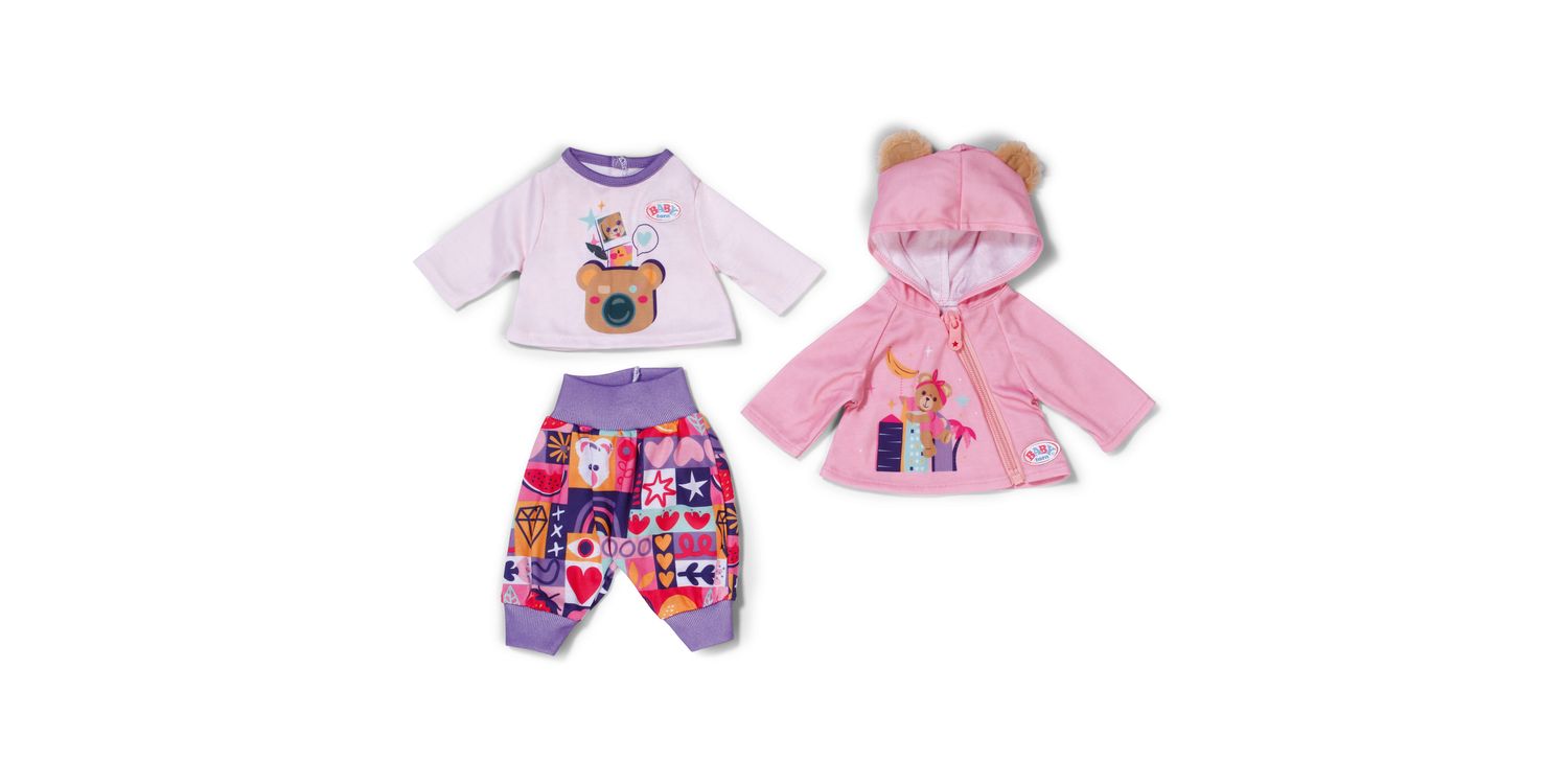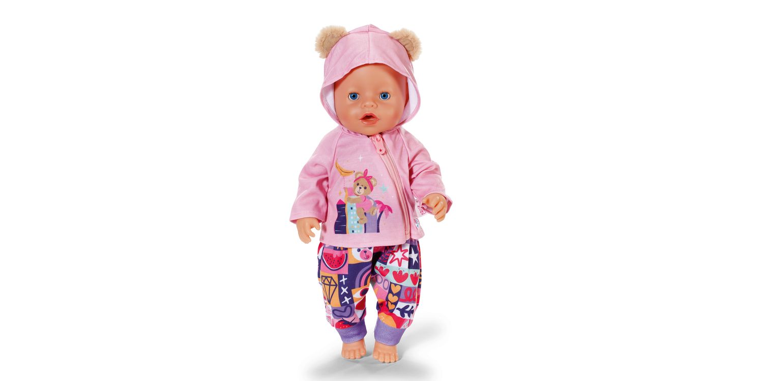The cute new-born outfit consists of three parts: a colourful bloomers with purple cuffs and patchwork pattern motifs in a variety of colours, a lilac long-sleeved shirt with teddy motif and a cute pink hooded jacket with really fluffy bear ears. BABY born will always by wrapped up warmly.