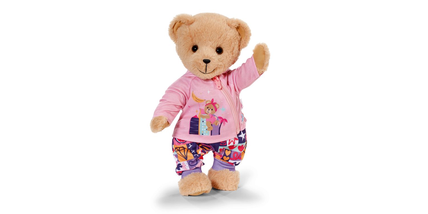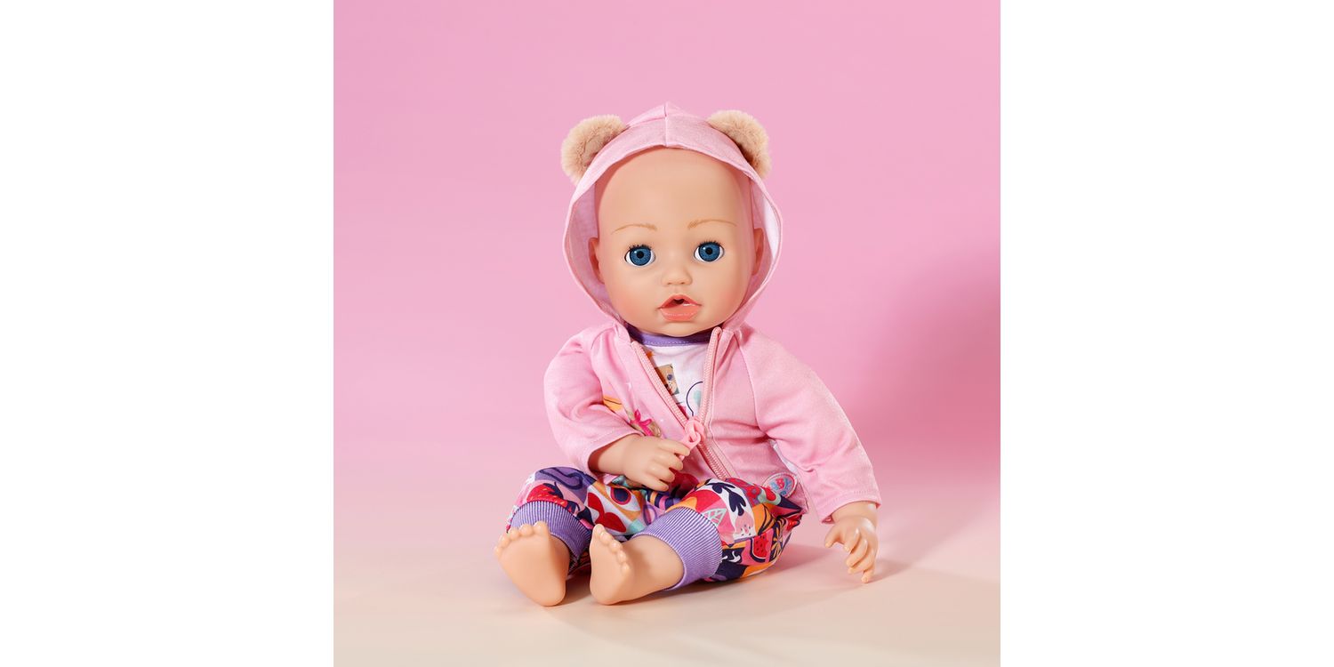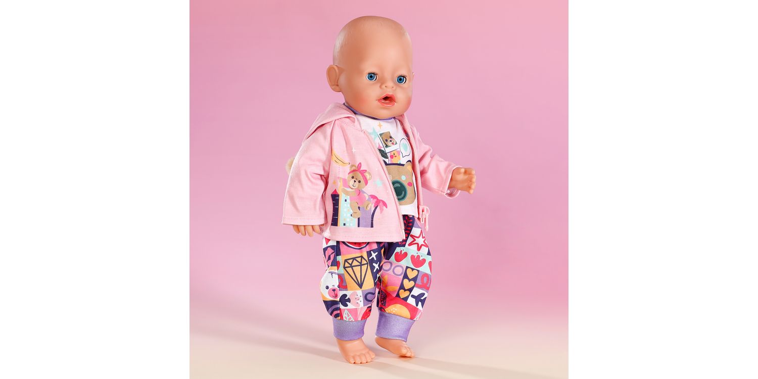 The cute new-born outfit consists of three parts: a colourful bloomers with purple cuffs and patchwork pattern motifs in a variety of colours, a lilac long-sleeved shirt with teddy motif and a cute pink hooded jacket with really fluffy bear ears. BABY born will always by wrapped up warmly.