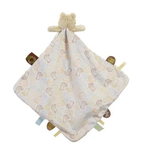 It's time to snuggle up with Pooh Bear! Based on the famous character from A.A Milne's heart-warming Tales from the Hundred Acre Wood storybooks, little ones will love to snuggle up with this baby soft Pooh Bear Comforter Blanket at story time or bed time. Easy to hold on to and created with developmental features to encourage interaction. The pattern on the reverse will help to focus babies gaze, textures and taggies with themed illustrations including a honeypot, a bee and a butterfly, will encourage sensory play. Suitable from birth, the hand washable comforter makes the perfect cuddly first companion for little one.
