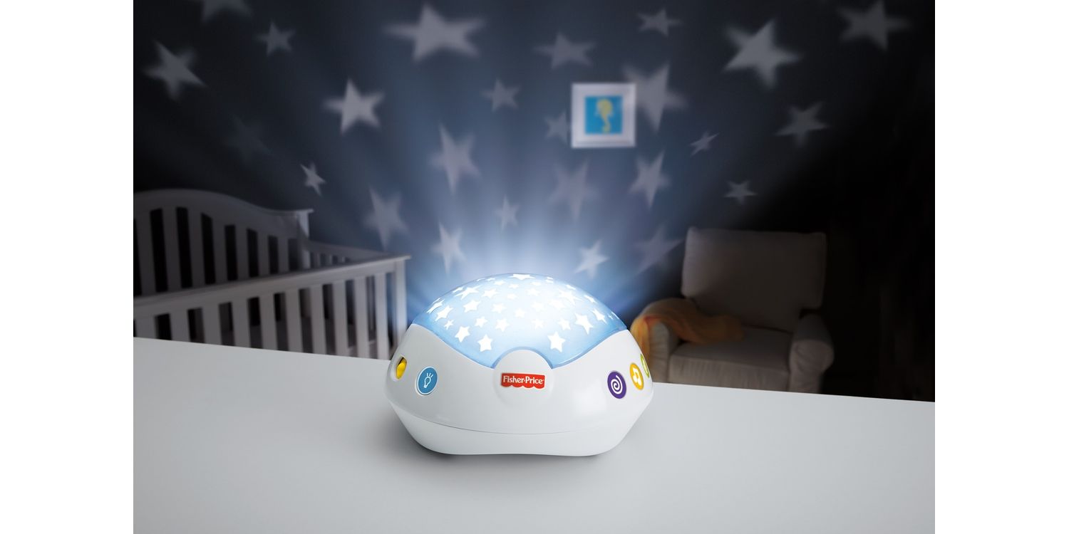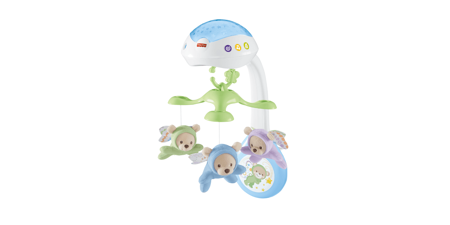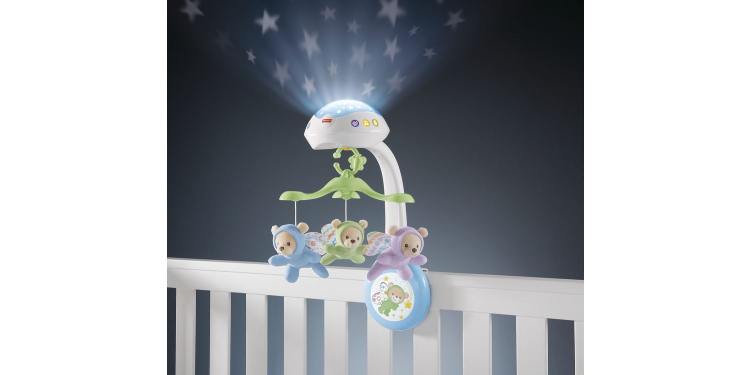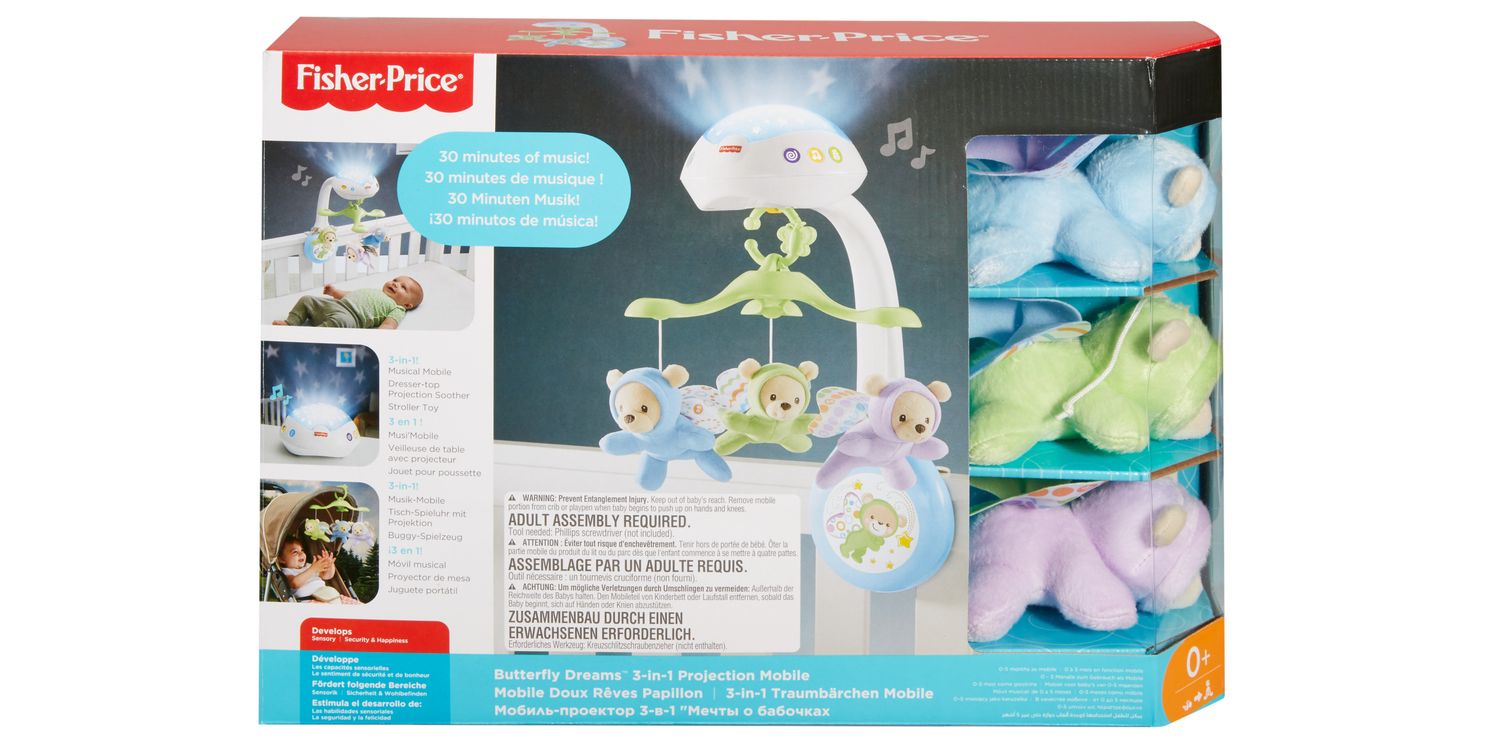 The Butterfly Dreams™ 3-in-1 Projection Mobile from Fisher-Price® helps soothe and comfort your baby from newborn to toddler. Newborns can gaze up at the motorized crib mobile with starry light show projection and three soothing musical settings. As your baby gets older, remove the mobile and convert the music and light unit to a tabletop projection soother to help maintain that hard-won bedtime routine. You can even link the mobile to your stroller canopy for entertaining on the go! This product may not attach to all crib designs.