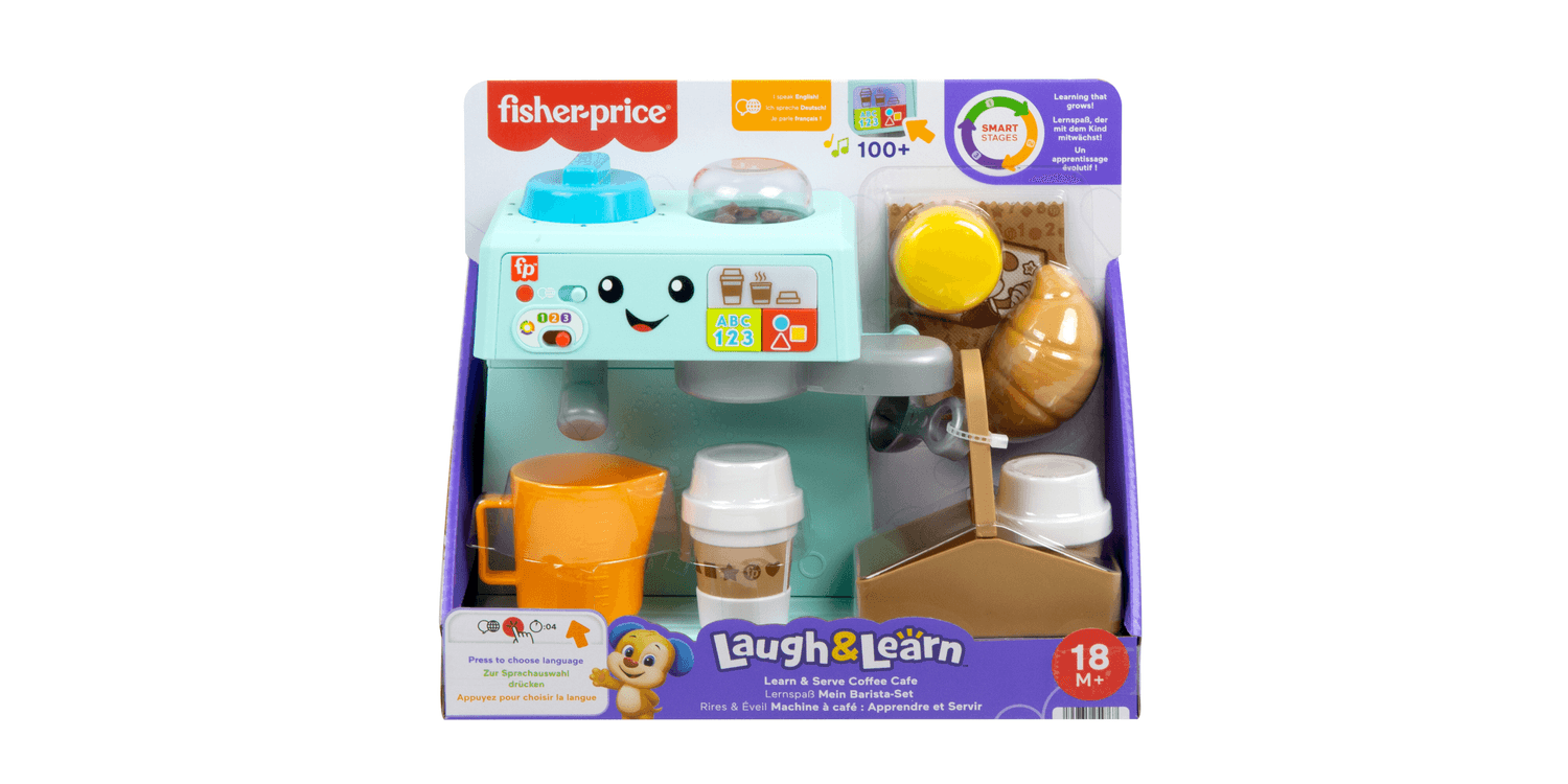Toddlers can brew up endless cups of fresh pretend play with the Learn & Serve Coffee Café playset from Fisher-Price. Styled like a real espresso machine, this interactive Laugh & Learn barista station comes with 10 role-play accessories and features 100+ songs, sounds and phrases that introduce the alphabet, colours, shapes and more. Kids can “grind” beans in the hopper, “steam” milk with the frother, and “brew” up drinks to serve their customers. And with Smart Stages technology, the learning fun grows along with your child with 3 levels of play! Use the globe button to select a language: English, German or French. Colours and decorations may vary.