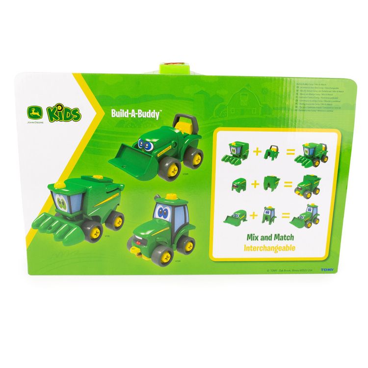 John Deere Build-a-Buddy brings take-apart toy fun to the farm! Young kids will have a great time using the included screwdriver to take Corey apart and then put him back together again. Once put together, Corey's free rolling wheels are perfect for push along play. This farm toy set includes a horse and pig on wheels who love going for a roll too! There's a barn for the animals to park in and fencing to help keep them safely inside. All toys in the Build-a-Buddy line feature interchangeable parts that can be swapped from vehicle to vehicle. Get creative and make a funny mashup farm vehicle with one of Corey's friends! (sold separately) Done for the day? The screwdriver stores easily under Corey's chassis so it'll be ready for more take-apart toy fun.