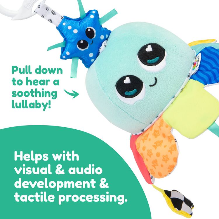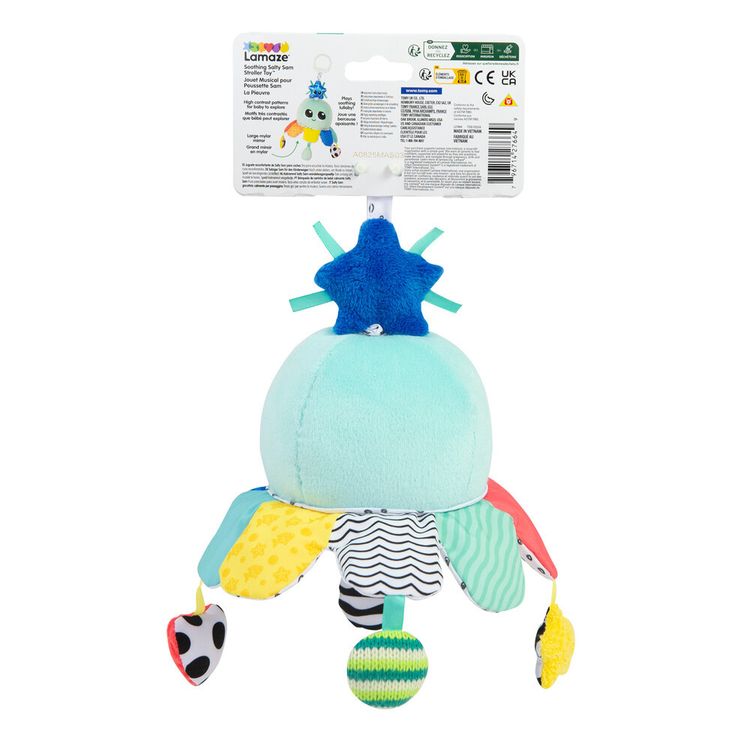 Set sail for sensory adventures with the Soothing Salty Sam Stroller Toy from Lamaze! This playful octopus is ready to delight your baby with interactive surprises, soothing sounds, and colourful fun. Pull him down and Salty Sam plays a gentle lullaby as he slowly rises back up towards his starfish friend. His body and tentacles feature vibrant colours and a variety of textures to capture your baby’s attention. Even the happy starfish on his head features satin ribbons for extra sensory discovery. A mylar mirror on the underside visually engages baby as they play. Sam includes an easy-to-use clip for strollers that makes him a perfect traveling companion for playtime wherever you go!