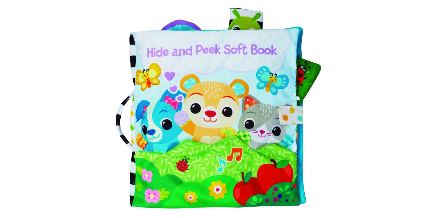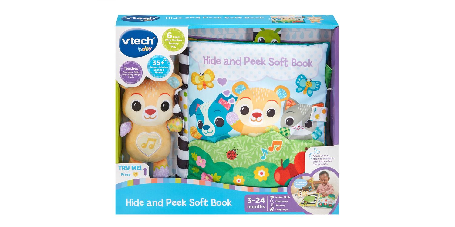Hello my friend! Welcome to the Hide and Peek Soft Book by VTech. This cute, 2-in-1 electronic cuddly bear & chunky, giant soft book will delight little ones! Press the light up heart button for fun responses as you pop Bear in and out of the interactive book pages. Feel and discover the sensory & tactile elements of the 6 soft pages – lift the flap apple, pop-out caterpillar, discovery mirror, textured flower, peek-a-boo crinkle leaf, bee squeaker and 3 fun pockets to pop Bear into. Bear plays friendly phrases, 20 melodies and 3 songs. Easily portable with attachment strap and carry handle. This cute, 2-in-1 electronic cuddly bear & chunky, giant soft book will delight little ones! Press the light up heart button for fun responses as you pop Bear in and out of the interactive book pages. Feel and discover the sensory & tactile elements of the 6 soft pages – lift the flap apple, pop-out caterpillar, discovery mirror, textured flower, peek-a-boo crinkle leaf, bee squeaker and 3 fun pockets to pop Bear into. Bear plays friendly phrases, 20 melodies and 3 songs. Easily portable with attachment strap and carry handle. WARNING: Keep this soft toy out of the sleeping environment for babies under twelve months to avoid suffocation risk. WARNING: Remove product from the infant carrier when vehicle is moving.