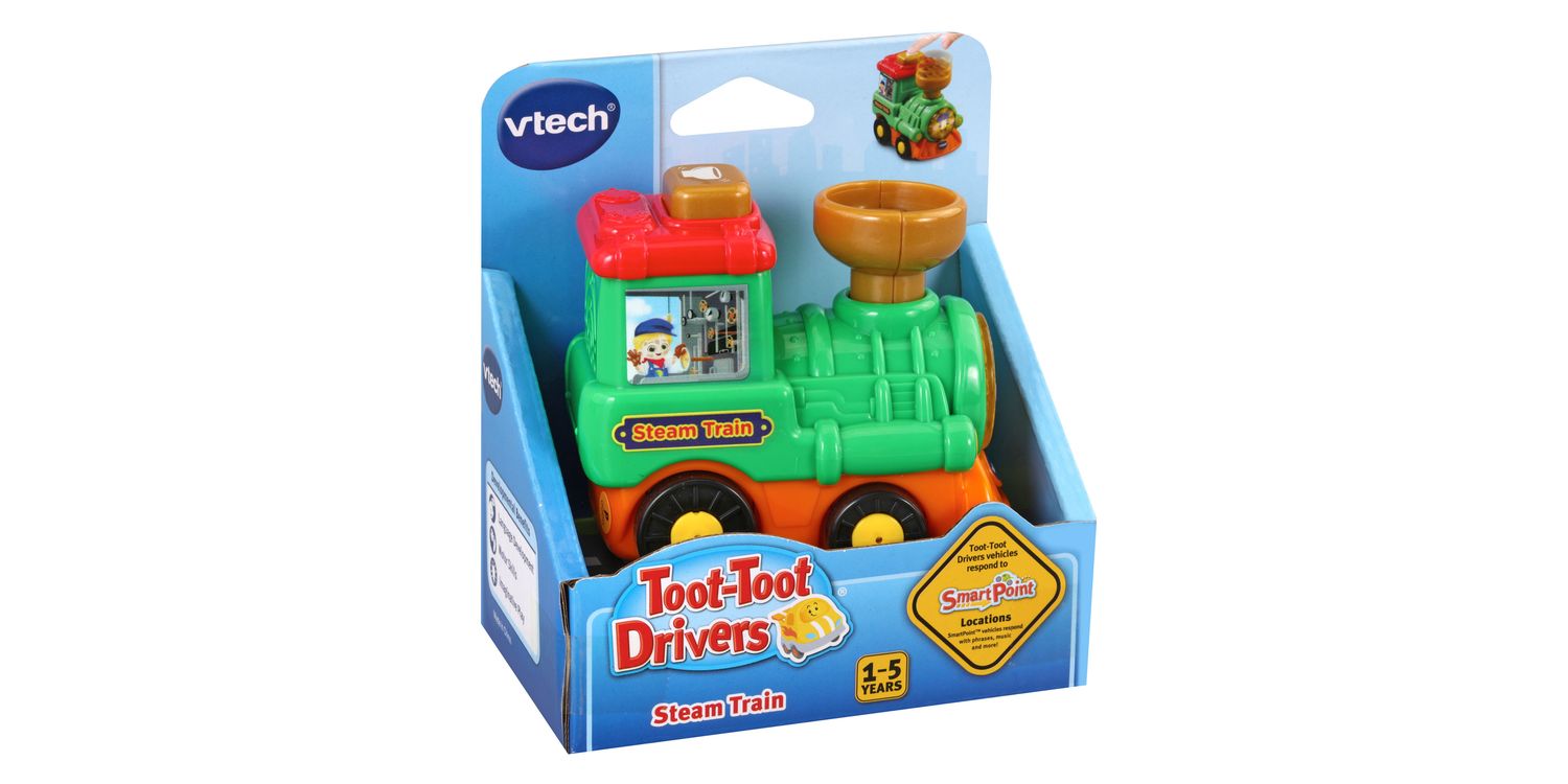 Hi, I'm a super Steam Train. Drive into the learning zone with the Toot-Toot Drivers Steam Train by VTech. This cute and chunky steam train is perfectly sized for little hands and will entertain your child with the light up face button that triggers fun music, realistic sound effects and songs. Push the stream train or press the feature button for more fun reactions and movements. Includes 3 sing-along songs and 6 lively melodies. Encourages motor skills, role-play fun, language development and imaginative play. Teaches singing, pretend play and sounds. The steam train responds to SmartPoint? locations with different phrases, sound effects and more on Toot-Toot DriversR play sets (each sold separately). Cute Steam Train will entertain your child with the light up face button that triggers fun music, realistic sound effects and songs. Push the train or press the button for more fun reactions and movements. Includes 3 sing-along songs and 6 lively melodies. Encourages motor skills, role-play fun, language development and imaginative play. Teaches singing, pretend play and sounds.