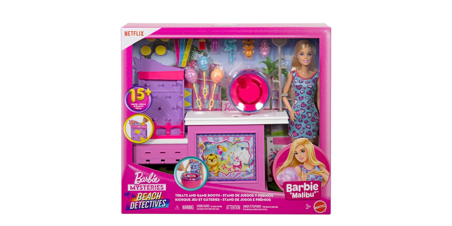 Imaginations can dream up all kinds of beachside stories with this Barbie Mysteries: Beach Detectives doll and game booth playset featuring 20 accessories!