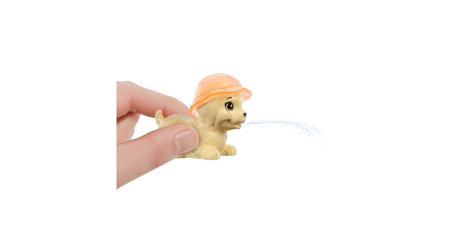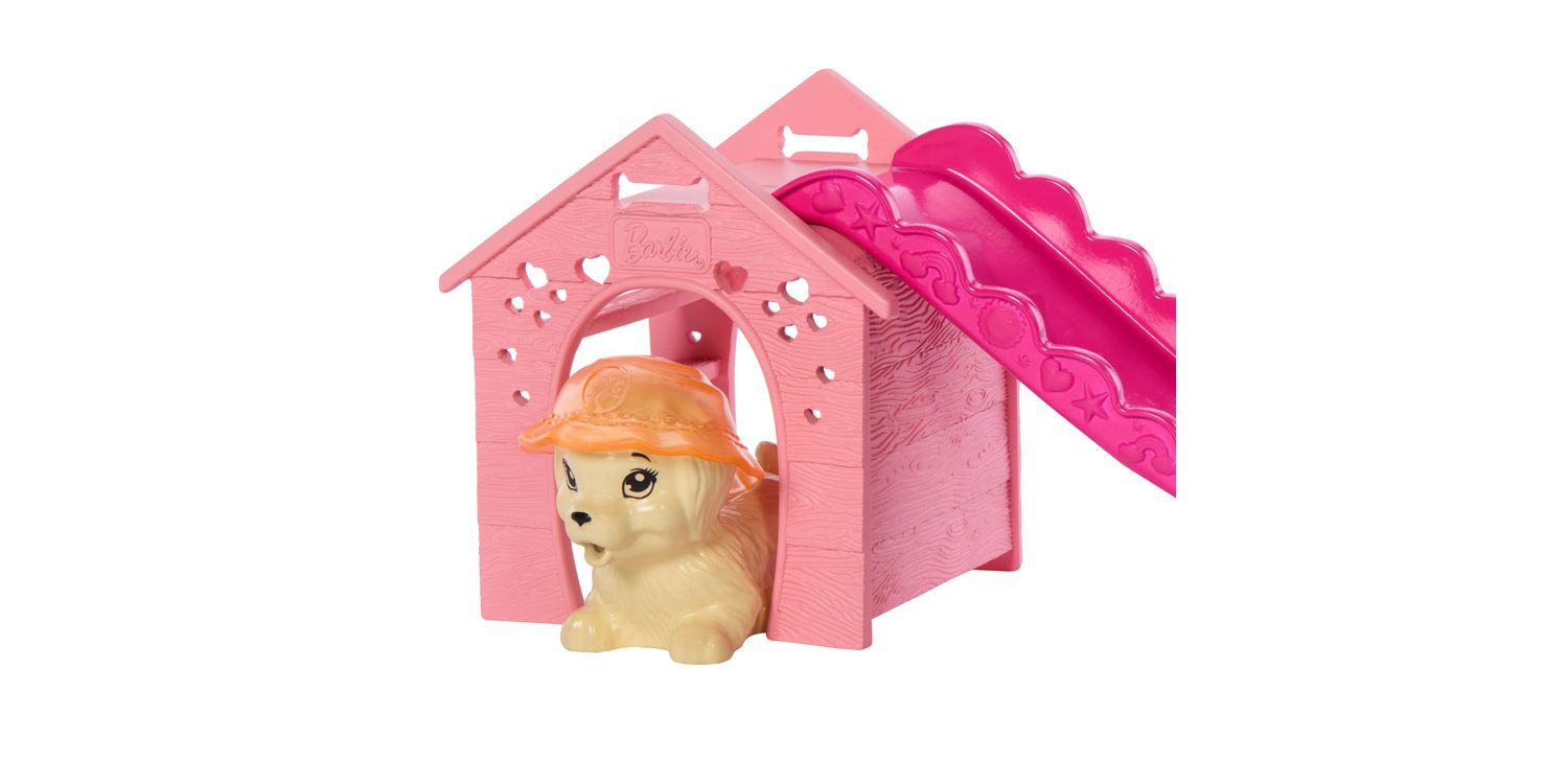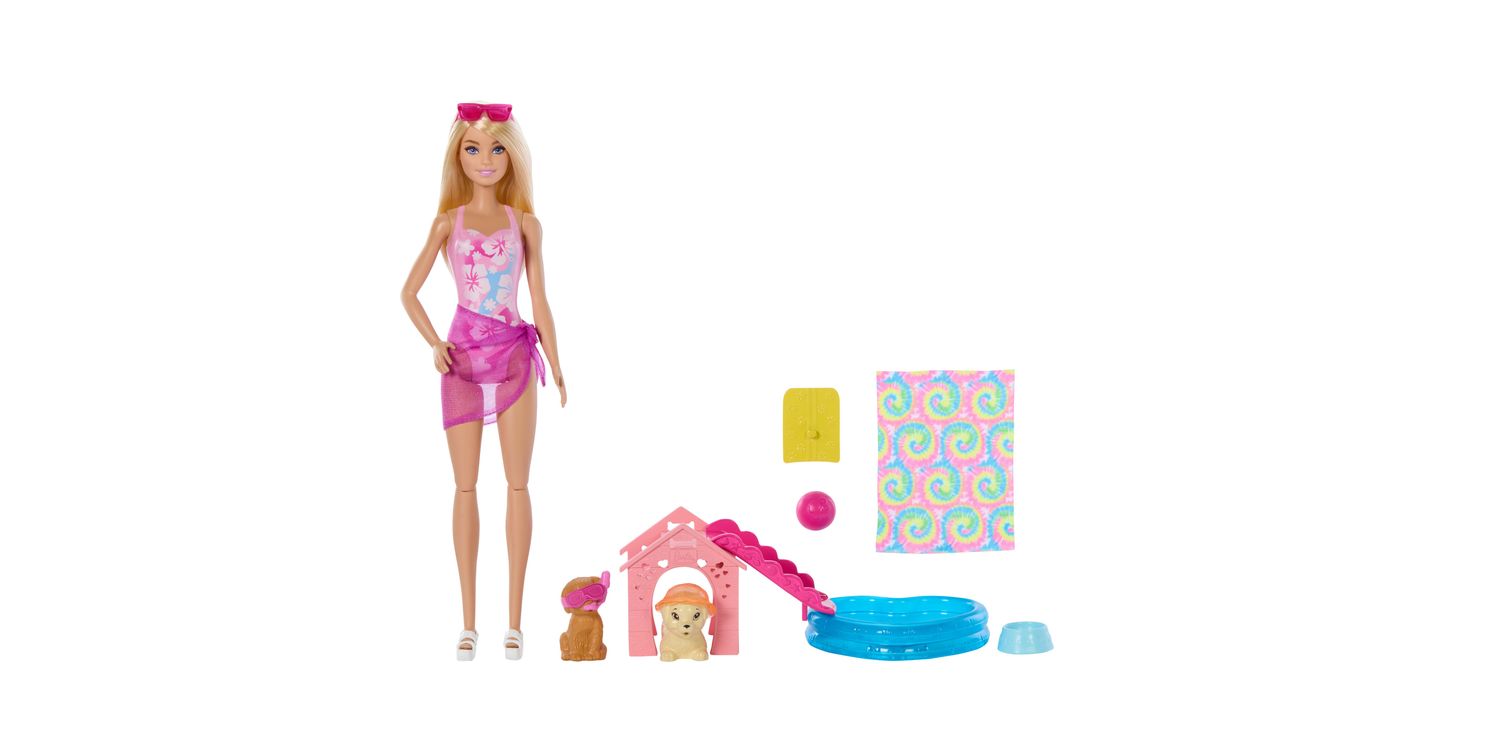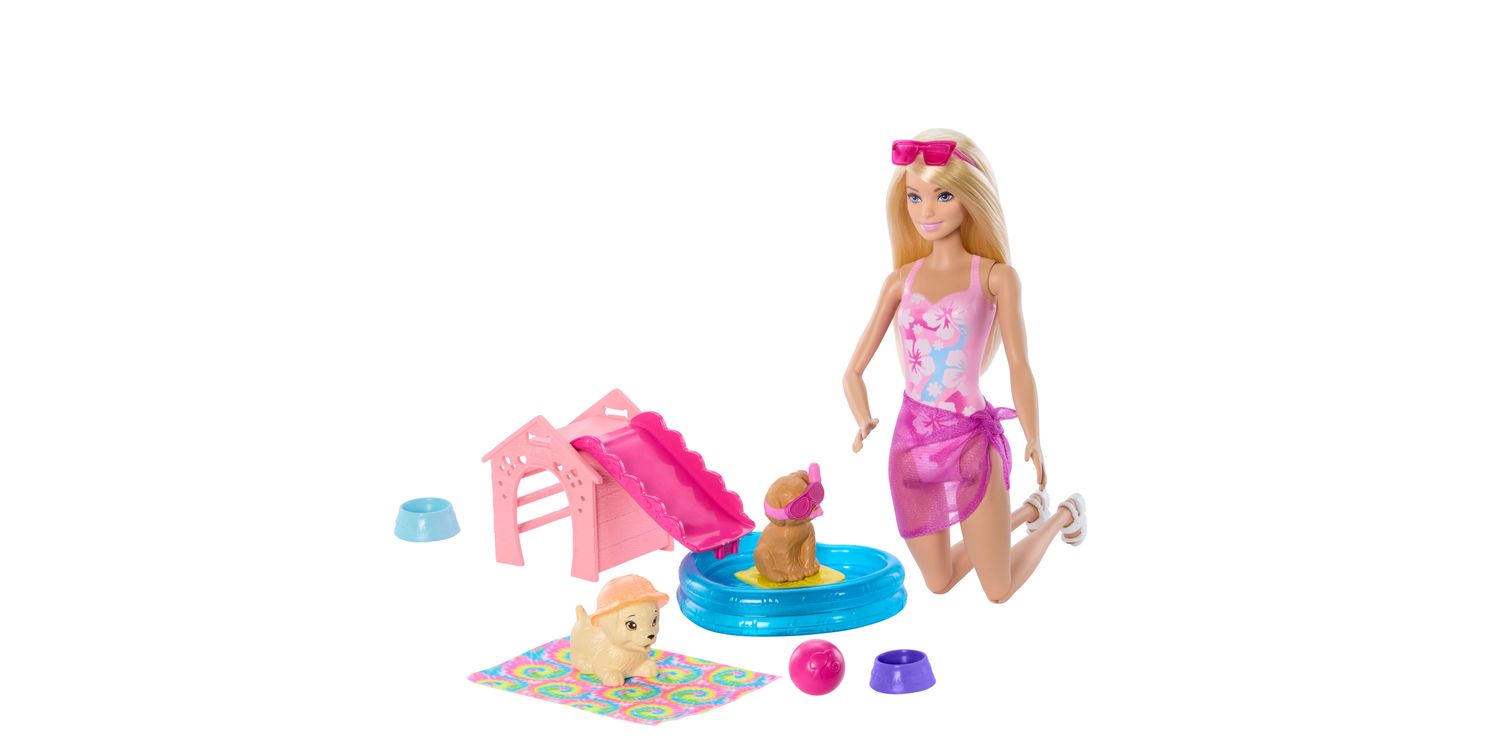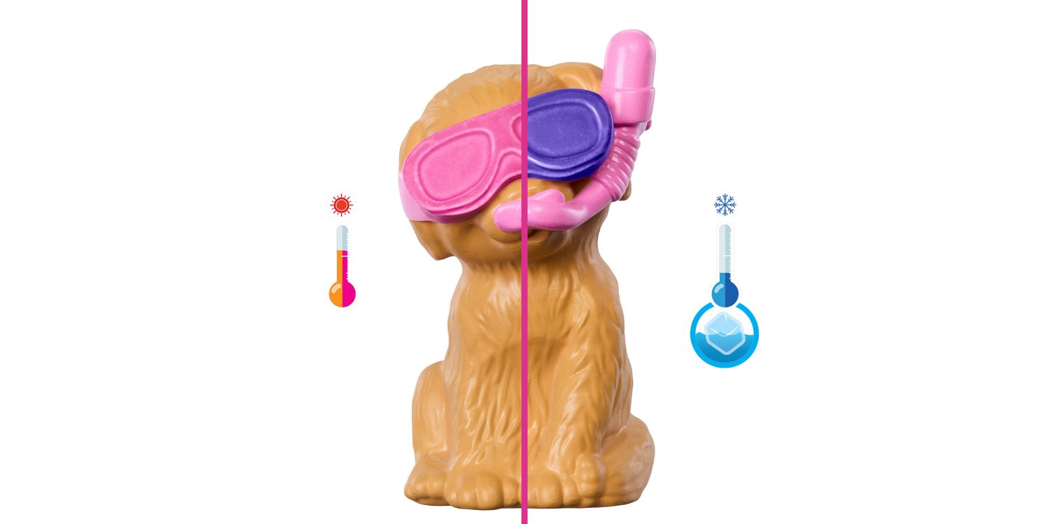 Race the pups down the doggy house slide and into the heart-shaped puppy pool. Squeeze the squishy puppy and it squirts water! For a colour-change surprise, use icy or warm water on the puppy with the goggles and snorkel. Kids can play out a pawesome pool day with accessories like a doggy boogie board, feeding bowls, a tie-dye towel, and more. Also included is Barbie doll in a swimsuit and cover up, ready to have fun with her furry friends!