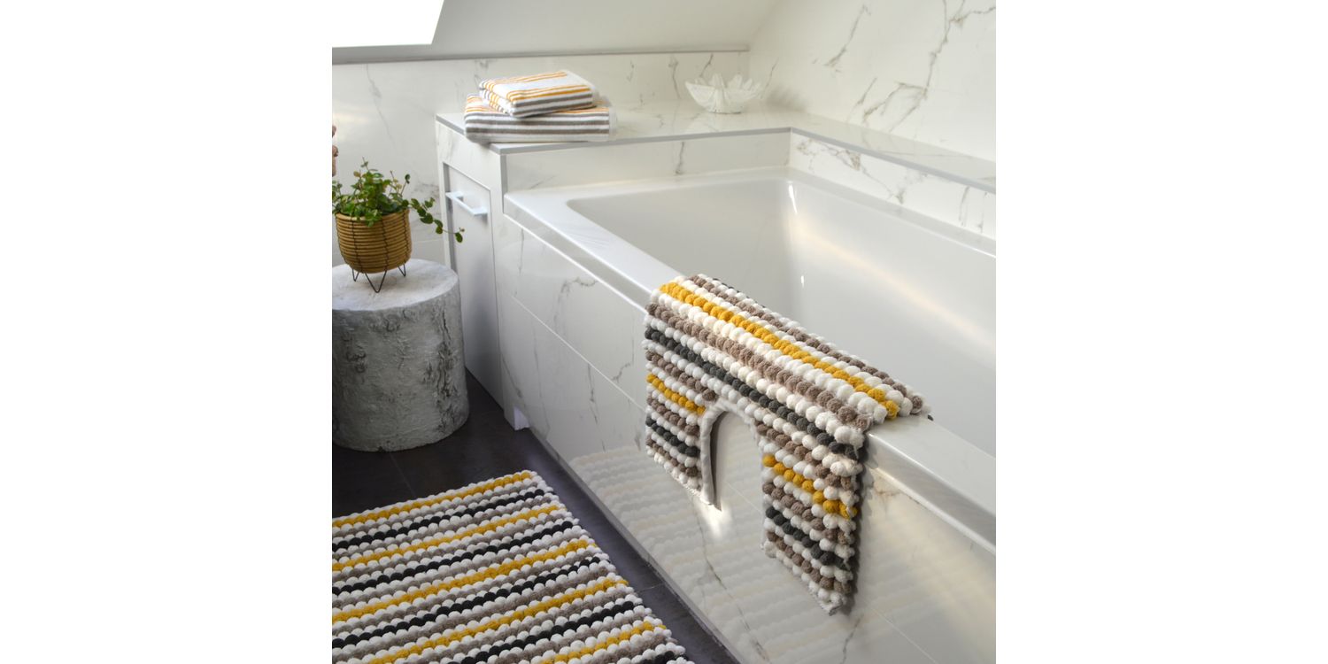 With its ultra-absorbent fibres, this stylish and on-trend mustard/grey bath mat soaks up water splashes and saves you from a slippery floor.