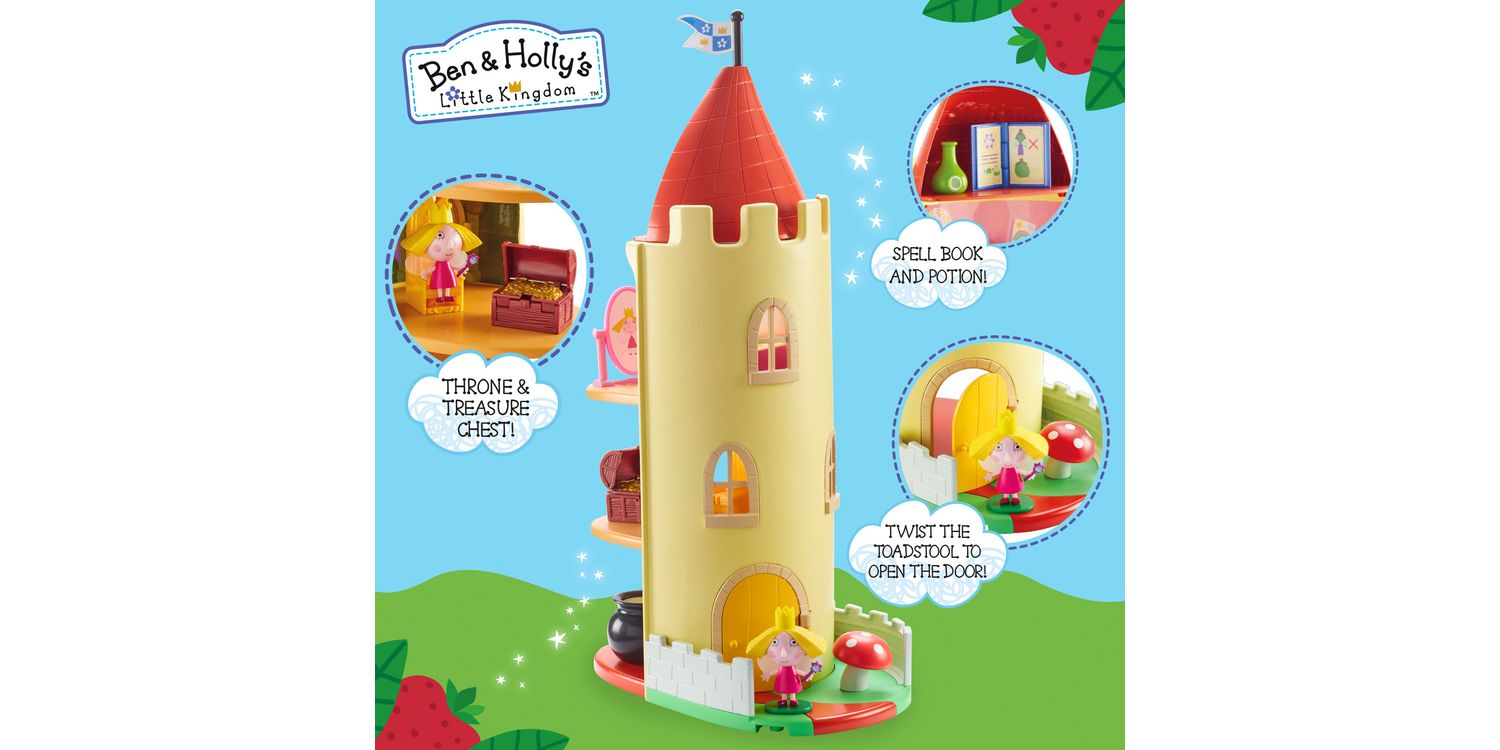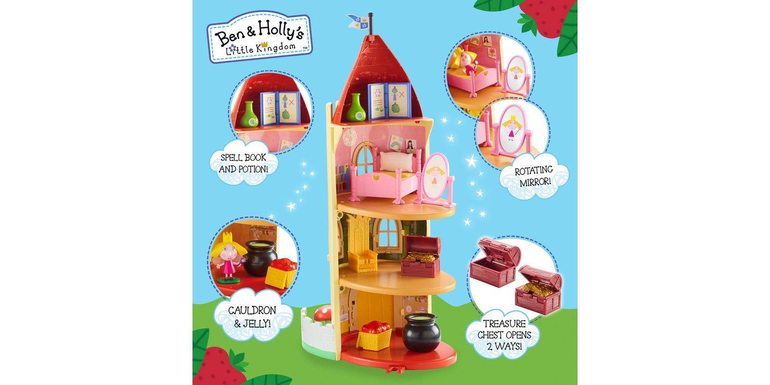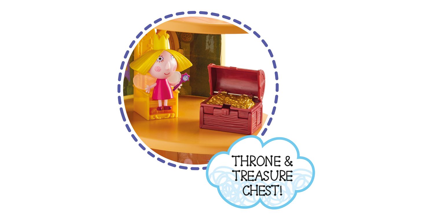Includes Princess Holly with detachable base. Scaled for play with other Ben & Holly figures and playsets. Castle, turret, flag, magical treasure chest, royal throne, spell book, potion bottle, jelly in basket, rotating mirror, bed, Princess Holly figure.