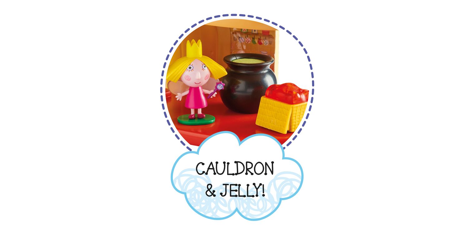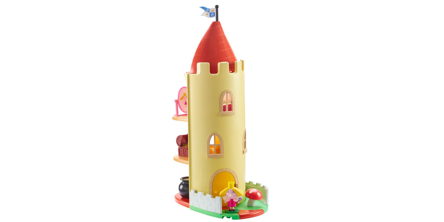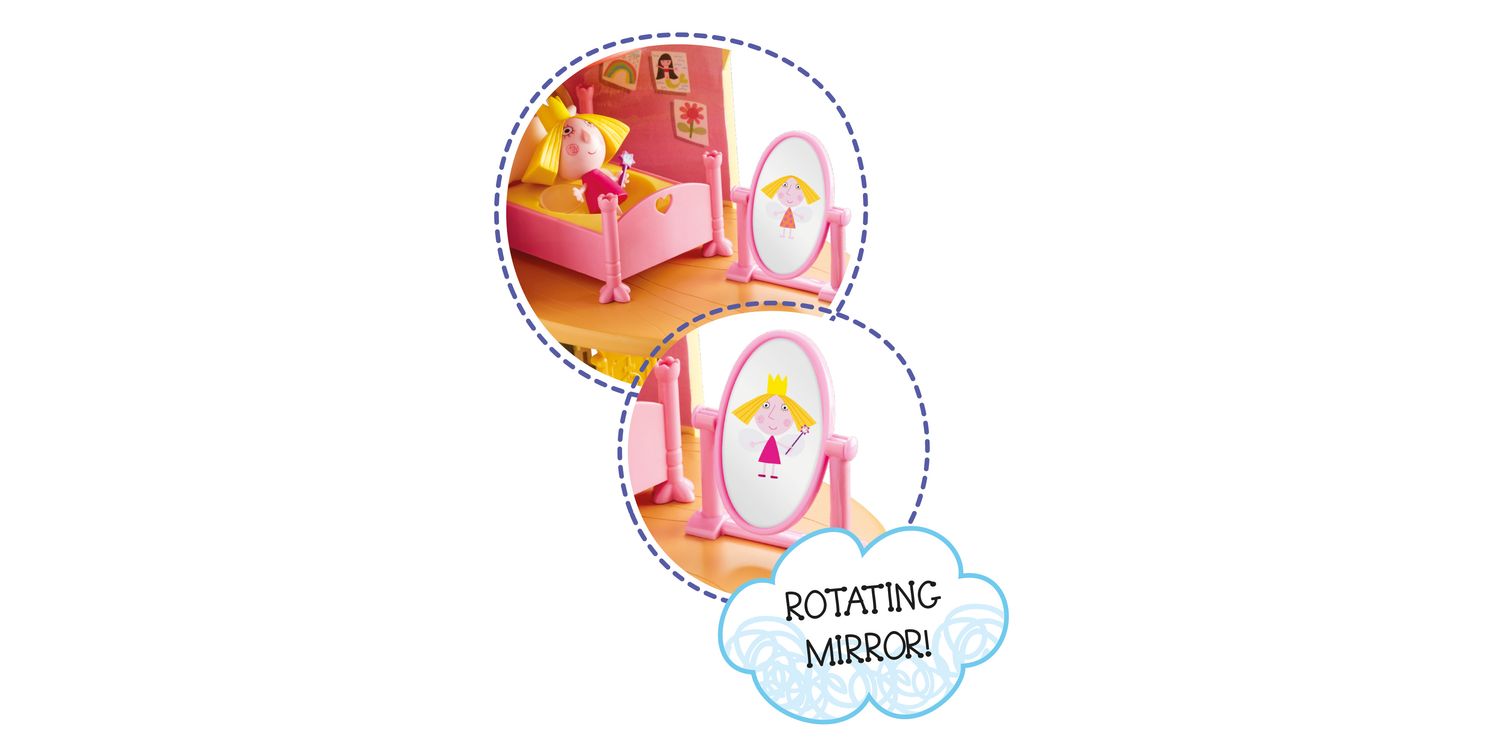 Includes Princess Holly with detachable base. Scaled for play with other Ben & Holly figures and playsets. Castle, turret, flag, magical treasure chest, royal throne, spell book, potion bottle, jelly in basket, rotating mirror, bed, Princess Holly figure.
