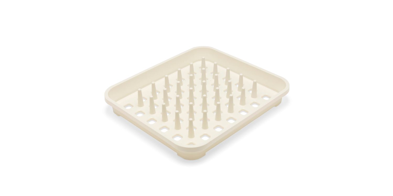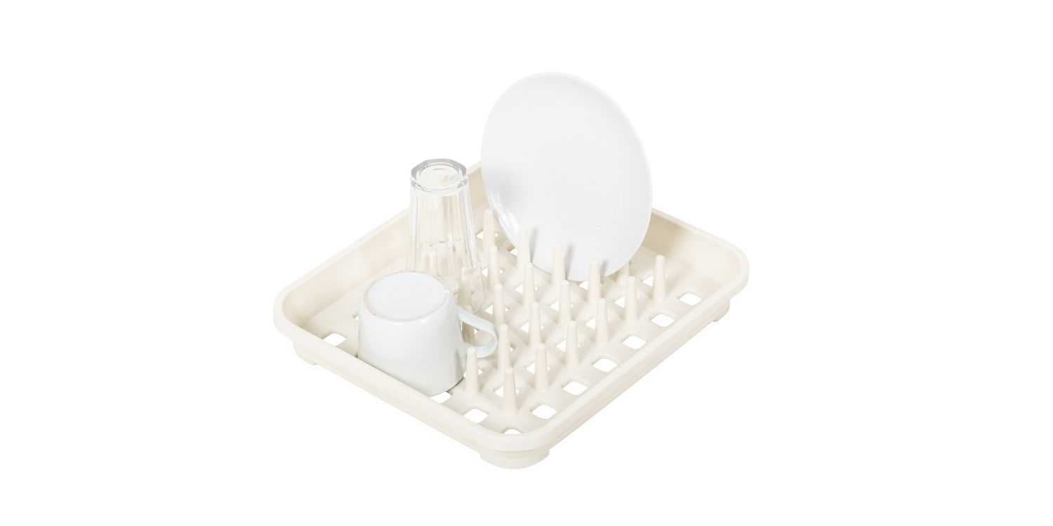 A contemporary sink side draining rack with unique flexi-slot design, holds plates, bowls and cups of all sizes. Space saving design compatible with the cutlery drainer.