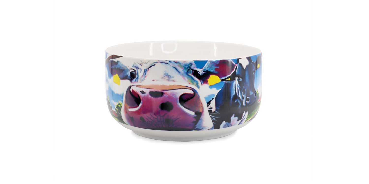 This Eoin O'Connor Fruit Bowl has the 'Breaking Boundries' cow artwork on the outside. Made from New Bone China this Fuit bowl can also be used as a salade Bowl and comes in a cow print gift box.