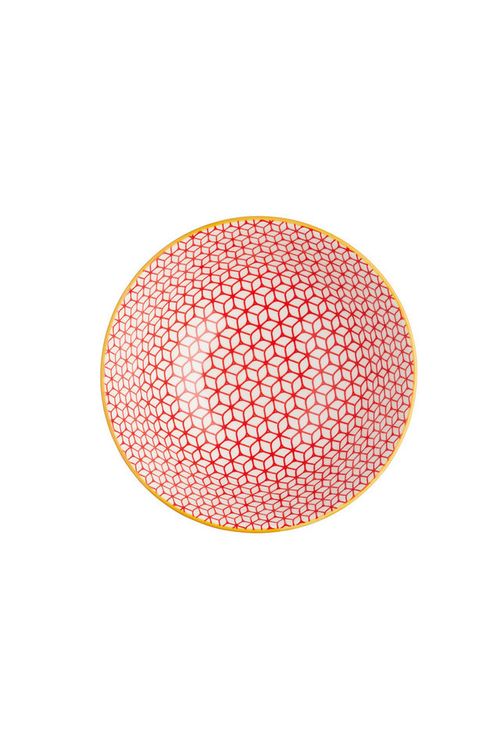 A good set of bowls is the cornerstone of every kitchen crockery set and, it doesn't get much better than this bright and cheerful bowl. The printed design features exciting and intricate red and blue geometric patterns, divided by a contrasting yellow rim. The perfect size for individual servings of porridge, soup, noodles and pie, this KitchenCraft bowl is ideal for daily use at meal and snack times. With its generously wide rim, you can also use it to serve up sides of salad and vegetables or generous helpings of dip. If you're planning a dinner party, its creative, colourful appearance makes it ideal for presenting delicious tapas dishes for sharing with friends, while instantly brightening up the table for any buffet or BBQ spread. The footed base gives the bowl extra height and means that any hot contents will stay at a safe distance from your surfaces. The stoneware is hardy and durable, so this collection of KitchenCraft bowls is ideal for daily use - they're dishwasher and microwave-safe safe, so they couldn't be easier to look after and keep clean.