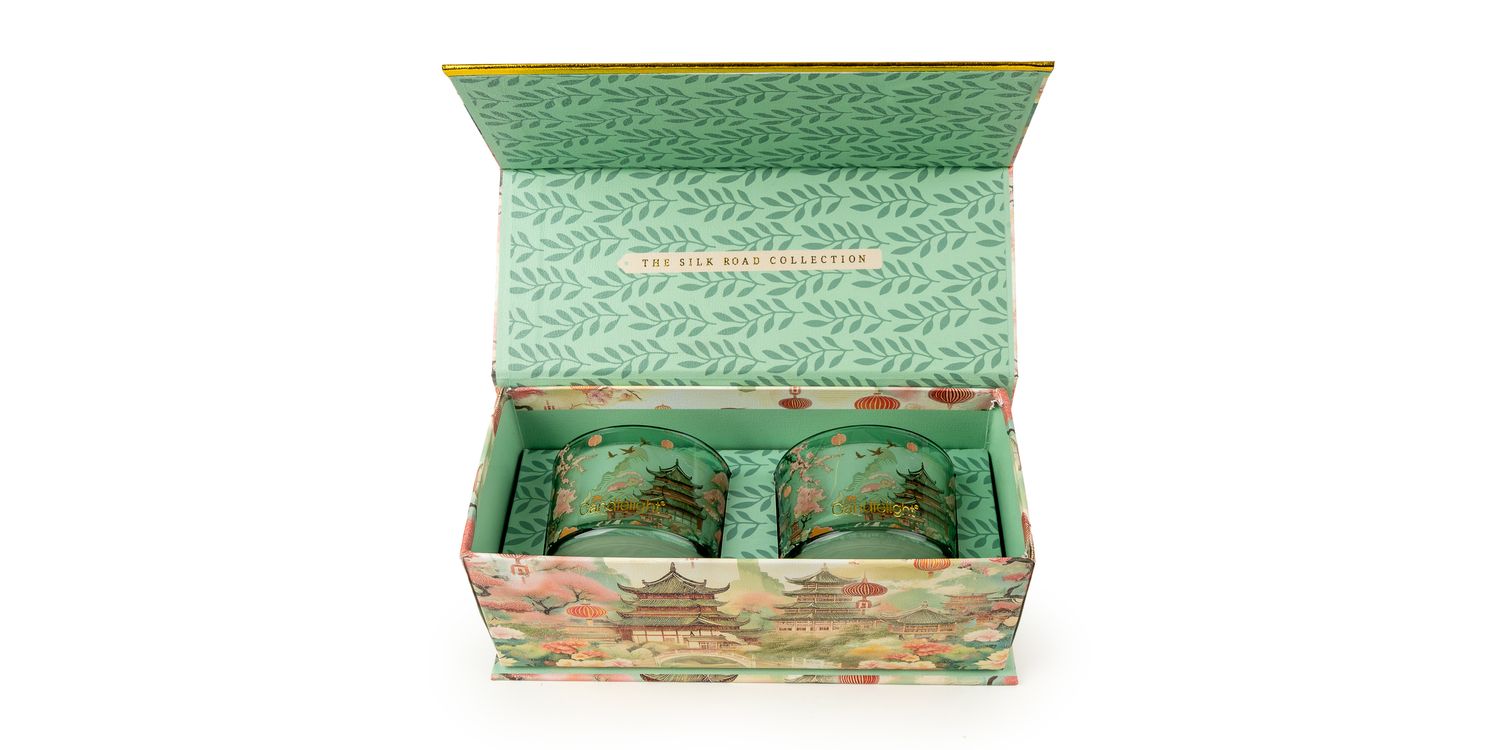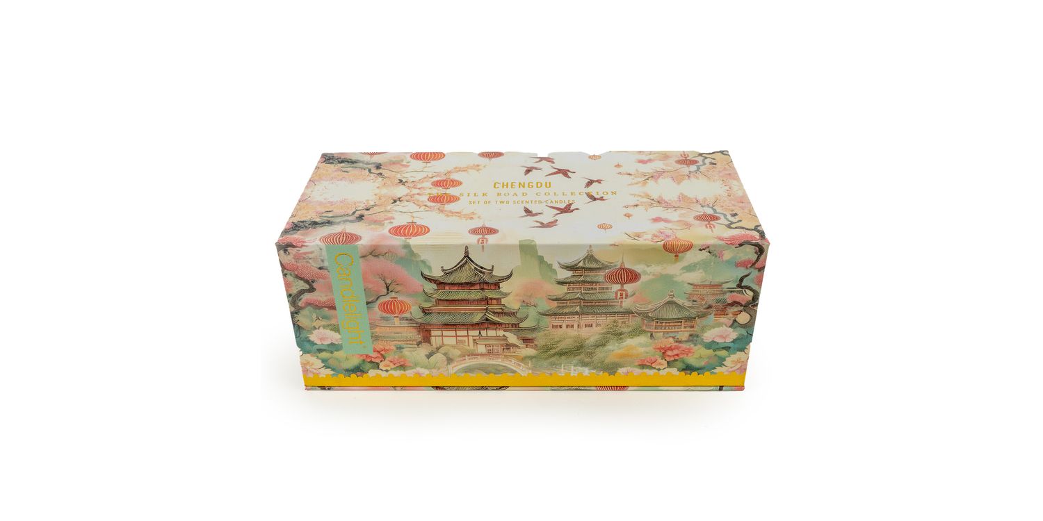 Illuminate your evenings with the LED Candle from The Silk Road Collection – Chengdu, a mesmerising jar swirling with gold flecks and a serene scene of blossom-laden trees, pagodas and floating lanterns.