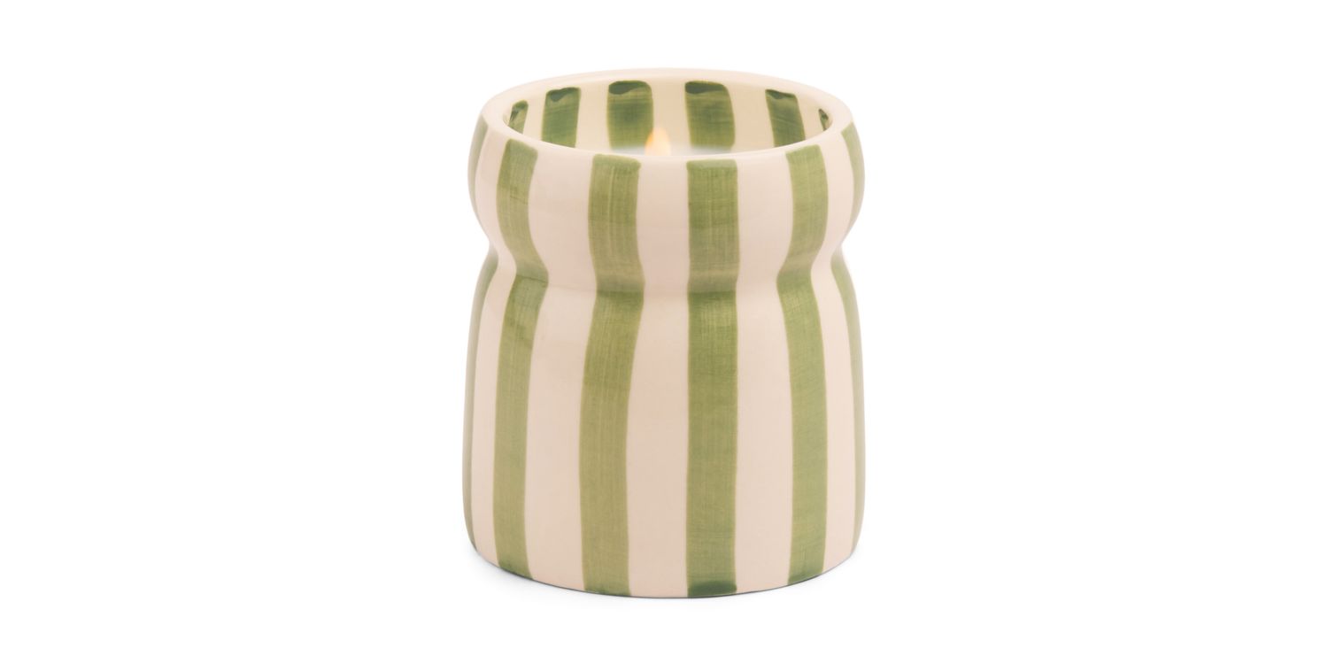 These hand painted candles inspired by striped umbrellas are perfectly sized and featured a unique pinched form. After the candle has burned, the food-safe ceramic vessel can be repurposed for your own culinary creations or as a charming decorative piece!