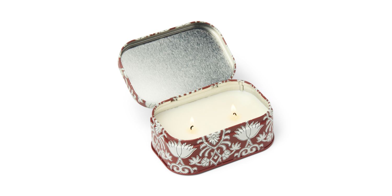 Available in two variations, the ceramic vessel features hand-painted details on a scalloped lid with a knob, and the coordinating patterned tins have a removable label for re-purposing, making it perfect for housing jewellery or trinkets. The new Cherie tin candle effortlessly brings a touch of charm to any space.