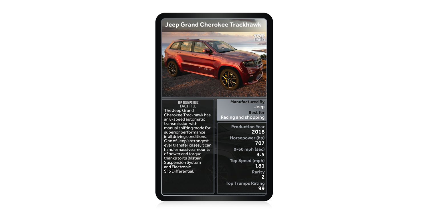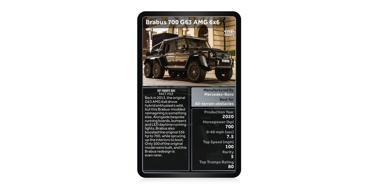 Time to take your adventures off-road and hit dirt tracks, rocky mountain paths, deserts and beyond with this stunning new edition of Top Trumps: 4x4 Ultimate Collection. Discover thirty of the finest 4x4s ever released and battle it out with friends and family to determine which one comes out on top. From the Willys MB, the US Army's iconic 4x4, to James Bond's very own Defender V8 Bond Edition, Tesla's Cybertruck, and the Xplorer Flying Car for a truly limitless journey, you're bound to pick up some old classics and discover some new vehicles as well. Pick from categories including Production Year, Horsepower, 0-60, Top Speed and Rarity; try your luck and figure out which car is best suited for Presidents, and which is perfect for evading dinosaurs! (Hint: you might have seen it on the big screen…) Whether you're a 4x4 owner yourself, or are just getting to grips with these multipurpose vehicles, Top Trumps has got you covered, so buckle up and start your engines!